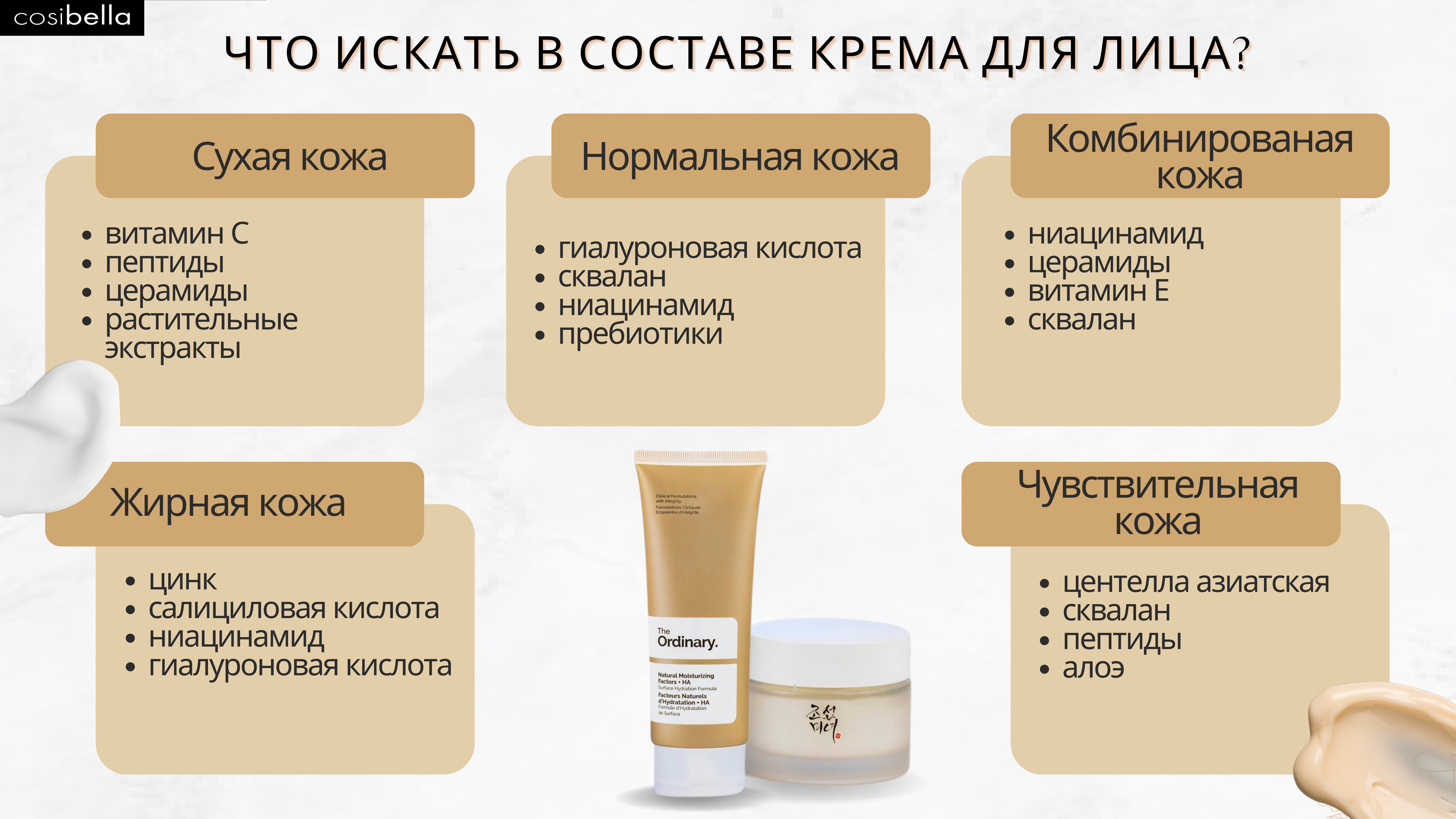 Почему это важно? Прежде всего, для интенсивного действия и эффективного результата в составе крема стоит искать активные вещества, которые способны улучшить состояние эпидермиса. В таблице ниже есть перечень компонентов, которые прекрасно подойдут для каждого типа кожи.