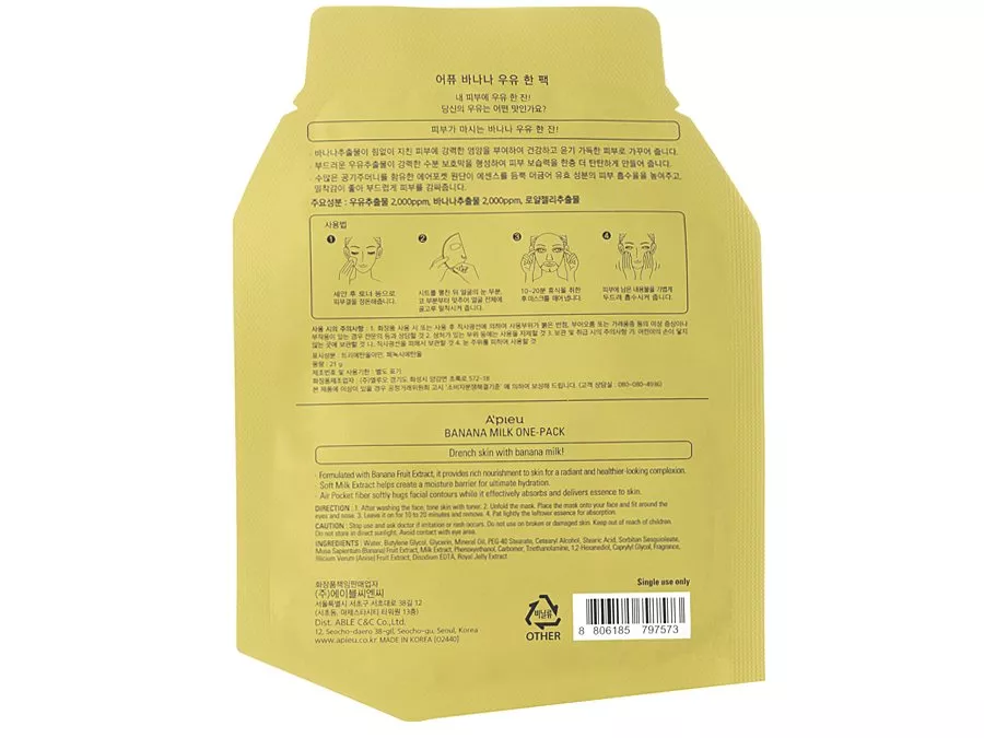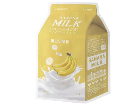 A'pieu - Milk One Pack Mask - Banana - питательная тканевая маска для лица. Экстракт банана увлажняет, смягчает и регенерирует эпидермис, экстракт молока увлажняет, снимает раздражение и обладает антивозрастными свойствами, а маточное молочко обладает противовоспалительными, регенерирующими и разглаживающими свойствами. Маска хорошо ложится по форме лица и подходит для всех типов кожи.
