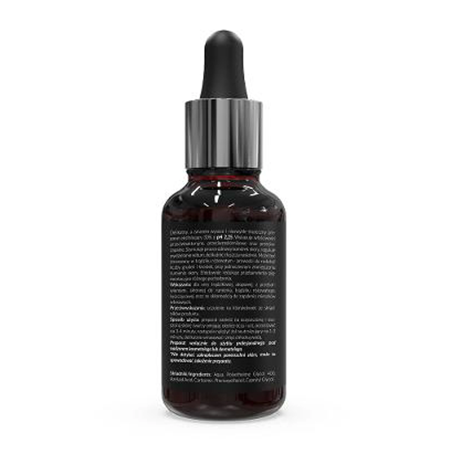- азелаиновая кислота 30% - уменьшает воспаление и эритему, обладает антибактериальным действием, регулирует выделение кожного сала, устраняет вредное воздействие свободных радикалов, осветляет пигментные пятна, мягко отшелушивает эпидермис, выравнивает тон кожи, уменьшает количество черных точек.