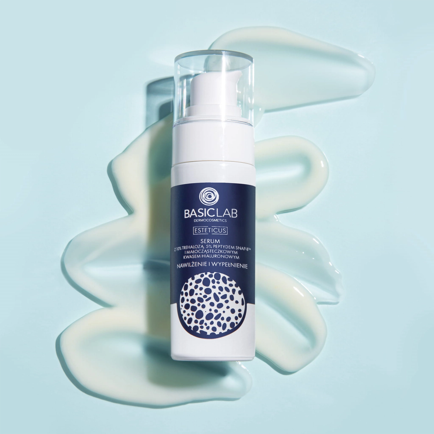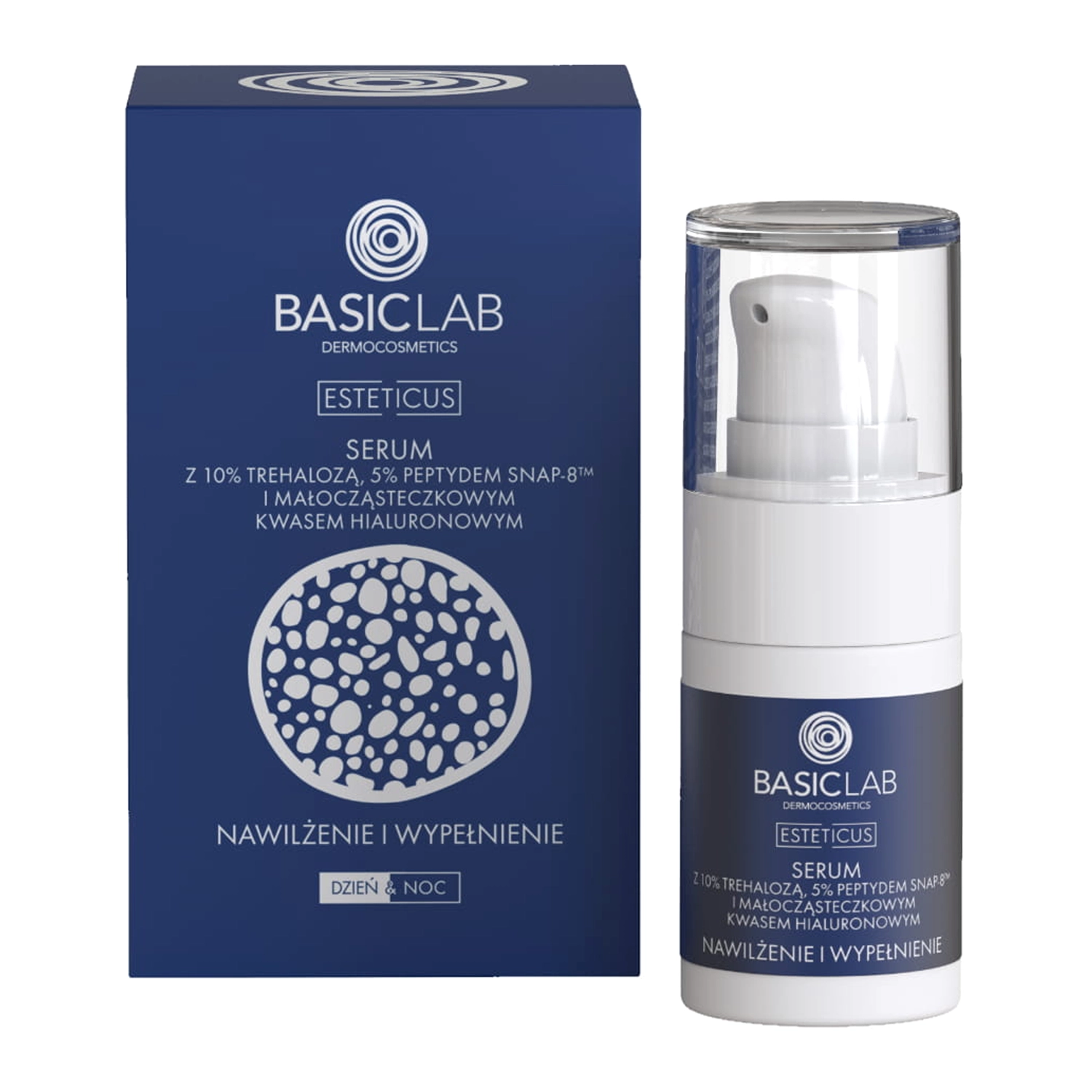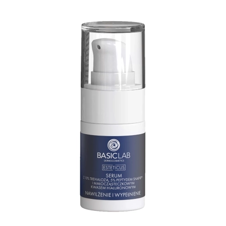 Basiclab - Esteticus - Сыворотка с 10% трегалозой, 5% пептидом SNAP-8 и низкомолекулярной гиалуроновой кислотой - сыворотка с увлажняющим и антивозрастным действием. Средство содержит до 10% трегалозы, которая удерживает влагу в эпидермисе, и до 5% нейропептида SNAP-8, он уменьшает мимические морщины и делает кожу более эластичной, а также 2 формы гиалуроновой кислоты с увлажняющим эффектом. Сыворотка обогащена регенерирующим скваланом, который успокаивает раздражения и является мощным антиоксидантом, ниацинамидом, предотвращающий появление пигментных пятен и регулирует работу сальных желез, и карбамидом, который смягчает и увлажняет кожу.