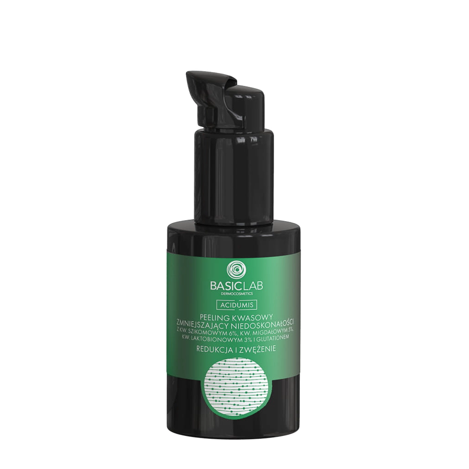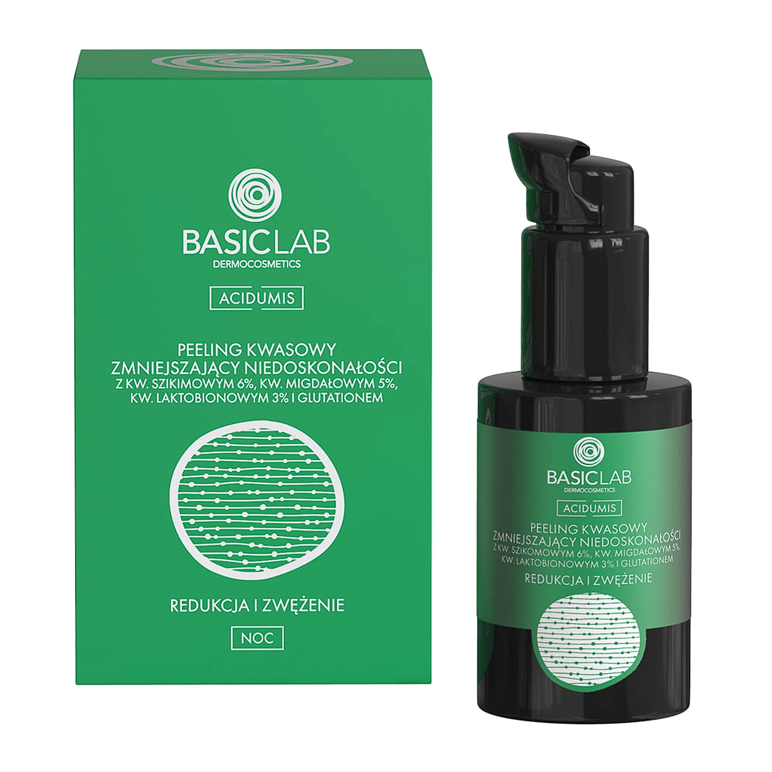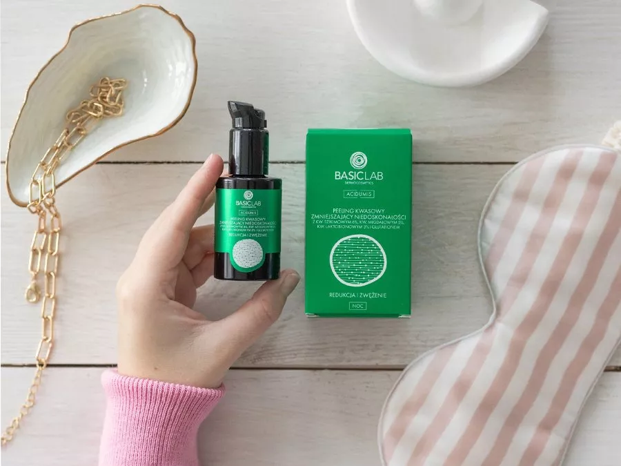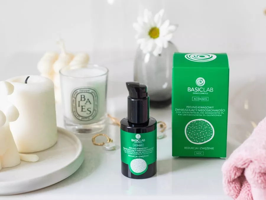 Basiclab - Acidumis - Кислотный пилинг для уменьшения недостатков - содержит шикимовую кислоту, которая работает синергетически с миндальной кислотой, удаляют мертвые клетки эпидермиса, оставляя эффект гладкой кожи, кроме того, они обладают себорегулирующим и антибактериальным действием. Кислота PHA - глюконолактон ускоряет регенеративные процессы эпидермиса, увеличивает уровень гидратации, а также осветляет кожу и укрепляет ее защитный барьер, делая ее менее склонной к раздражению и покраснению. Кроме того, глутатион и ресвератрол обладают антиоксидантным и антивозрастным действием. Средство разглаживает эпидермис, осветляет пигментные пятна и придает коже сияние. Регулярно применяемый пилинг осветлит пигментацию, отрегулирует количество выделяемого кожного жира и уменьшит количество недостатков.
