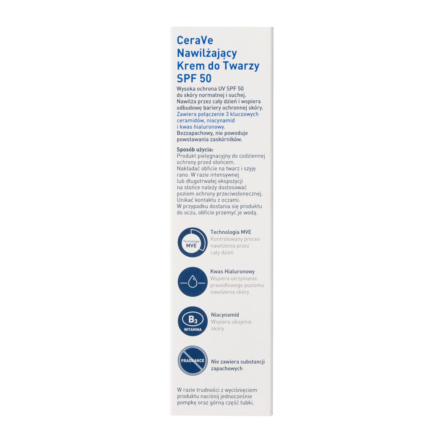 CeraVe - Увлажняющий крем для лица с SPF50 - солнцезащитный крем для всех типов кожи. Содержит химические фильтры, которые защищают кожу от ультрафиолетового излучения. Он обогащен тремя видами церамидов, которые укрепляют липидный барьер кожи и защищают ее от пересушивания. Ниацинамид обладает антиоксидантным и противовоспалительным действием, эффективно уменьшая покраснения и раздражения кожи, а также регулируя работу сальных желез и выравнивая цвет кожи. Холестерол смягчает, разглаживает и улучшает эластичность эпидермиса, а гиалуронат натрия интенсивно увлажняет. Крем защищает кожу от негативного воздействия солнечного излучения, дополнительно увлажняет и успокаивает ее. Не содержит ароматизаторов.