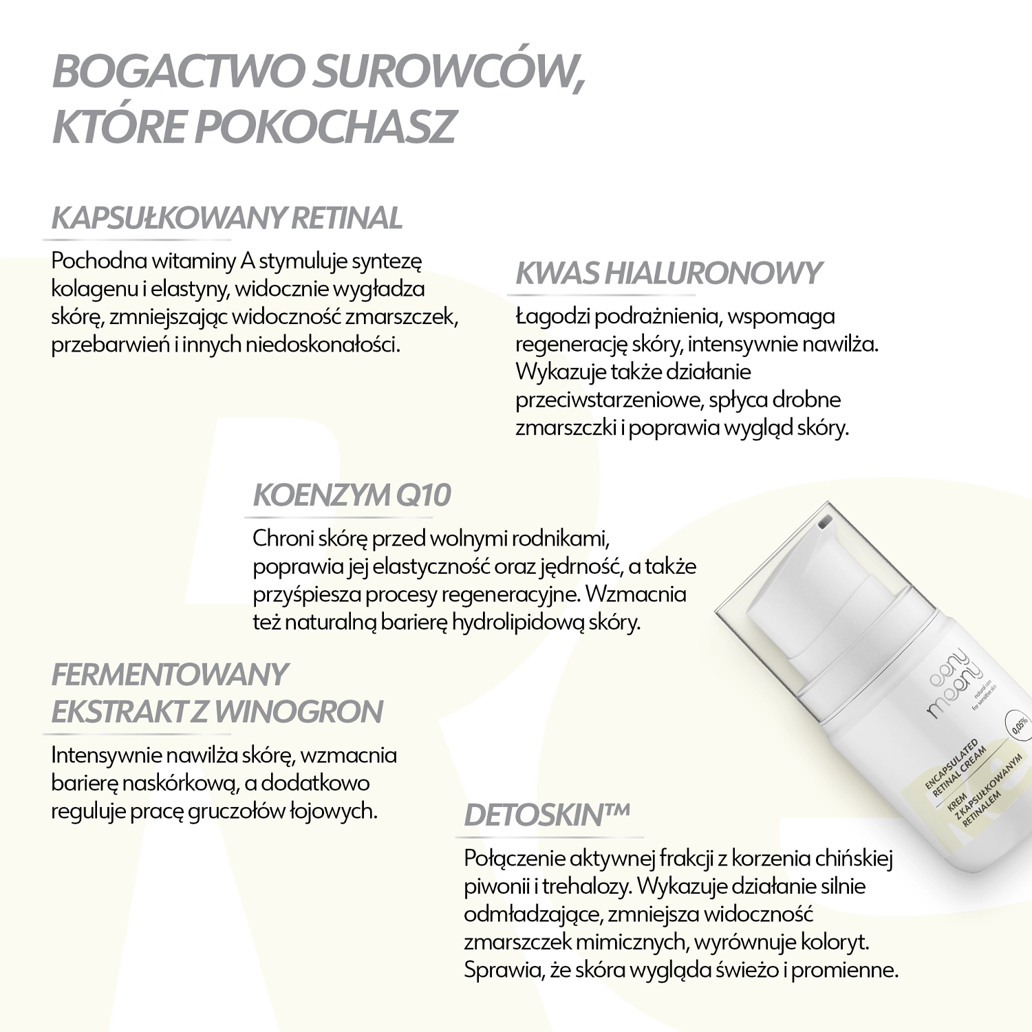 Eeny Meeny - Encapsulated Retinal Cream 0.05% - крем для лица с производной витамина А - ретиналем в концентрации 0,05%. Благодаря такой концентрации компонента продукт подходит для формирования толерантности кожи. Ретиналь выравнивает структуру эпидермиса, осветляет пигментацию, устраняет несовершенства и сужает поры, выравнивает тон кожи, стимулирует синтез коллагена и эластина, уменьшает выделение кожного сала. Ретиналь, благодаря инкапсуляции в липокапсулы, является более стабильным и подходит для чувствительной и склонной к аллергии кожи. Кроме того, формула крема обогащена увлажняющими и успокаивающими компонентами, которые балансируют действие ретиноида, например коэнзим Q10, ферментированный экстракт винограда и масло черной смородины. Вместе они предотвращают возможное раздражение и сухость кожи.