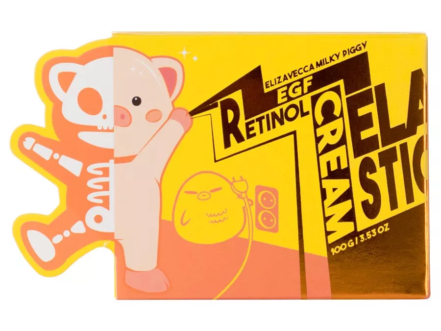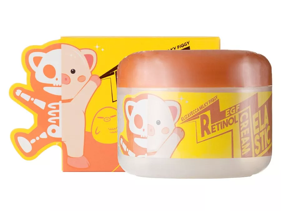 Elizavecca - Milky Piggy EGF Elastic Retinol Cream - крем на основе экстракта ласточкиного гнезда с добавлением витамина А в форме ретинола. Оба компонента обладают антивозрастным действием, осветляют кожу и сглаживают неровности. Ретинол также является мощным антиоксидантом. Масло макадамии отвечает за увлажнение и защиту эпидермиса, а ниацинамид помогает уменьшить избыточное производство кожного сала и обладает противовоспалительными свойствами. Крем регулирует выработку кожного сала и в то же время увлажняет и питает кожу, эффективно борясь с признаками старения и пигментными пятнами.
