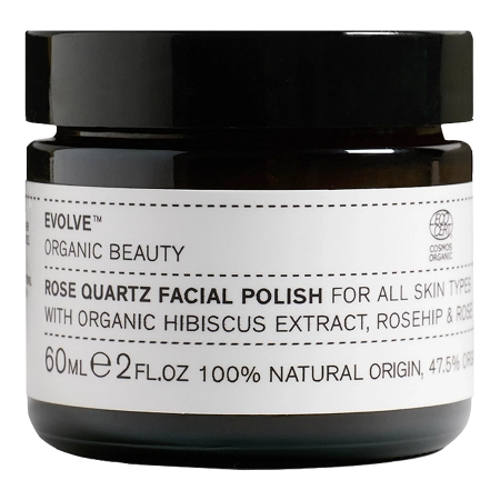 Evolve Organic Beauty - Rose Quartz Facial Polish - скраб для всех типов кожи, особенно для зрелой и неровной кожи. Частицы розового кварца отшелушивают омертвевшие клетки кожи. Масло семян шиповника и масло цветков дамасской розы предотвращают чрезмерное испарение воды, смягчают и успокаивают. Экстракт цветков гибискуса обладает антиоксидантными и осветляющими свойствами. Его действие поддерживается витамином Е, который является сильным антиоксидантом, защищающим от свободных радикалов. Гидролат сладкого апельсина помогает бороться с бактериями и другими микроорганизмами и снимает покраснение.