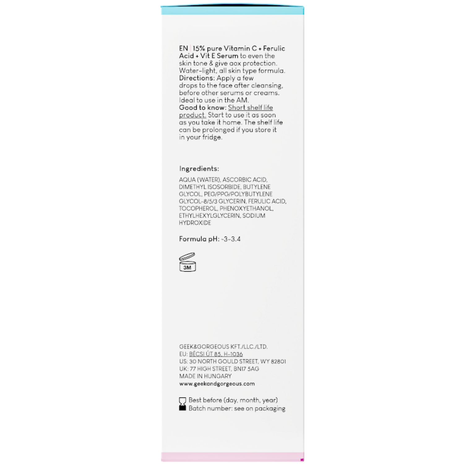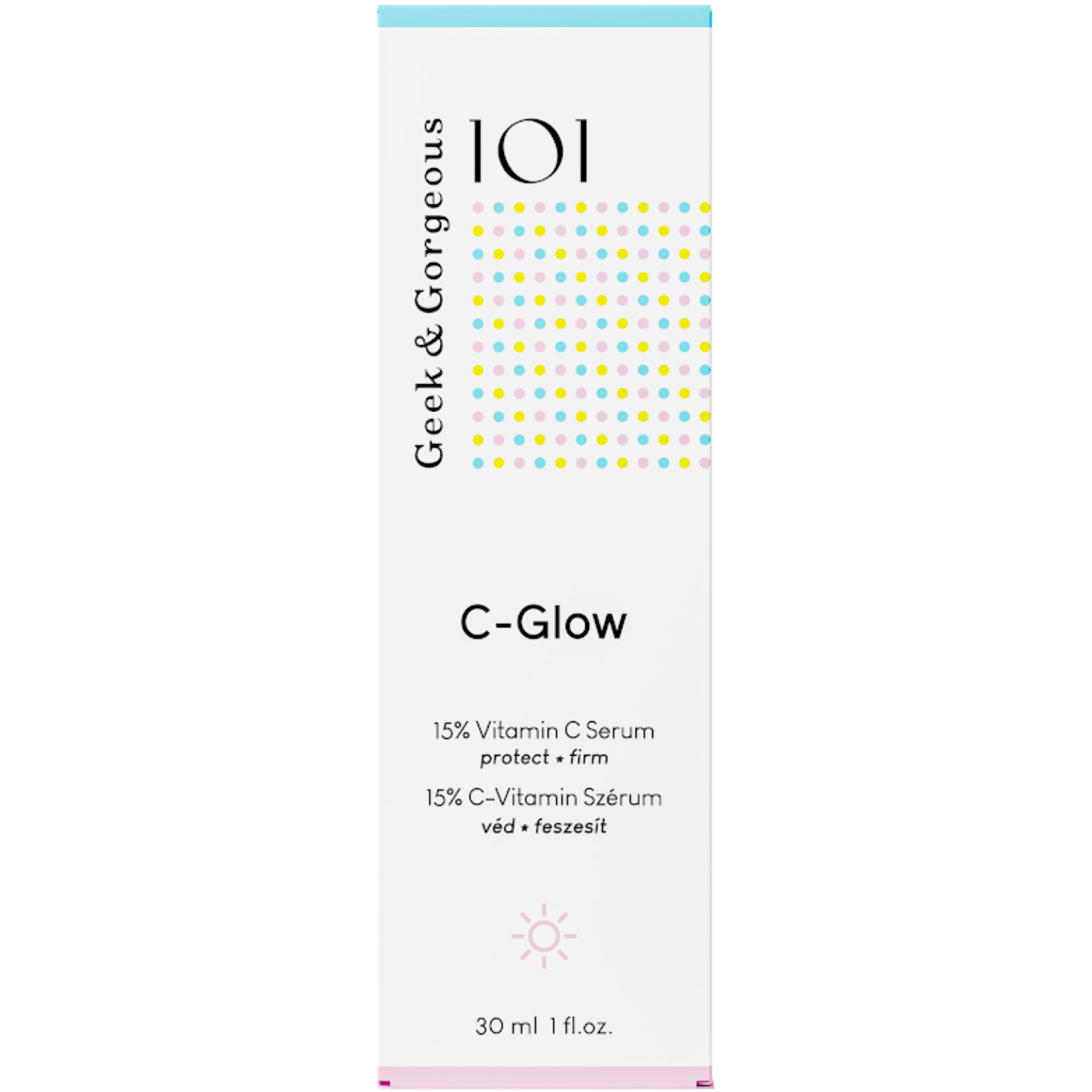 Geek & Gorgeous - C-Glow - сыворотка против морщин, содержащая три компонента с сильными антиоксидантными свойствами. Витамин С в концентрации 15%, помимо борьбы со свободными радикалами, влияет на синтез коллагена, замедляя процесс старения кожи, выравнивает ее цвет, уменьшая заметность пигментных пятен. Сыворотка обогащена феруловой кислотой и витамином Е, которые также являются антиоксидантами, способствуют стабильности витамина С и усиливают его действие. Сыворотка имеет легкую формулу на водной основе и быстро впитывается. Имеет pH 3,2–3,4. Подходит для всех типов кожи, которые нуждаются в антиоксидантом действии и выравнивании цвета, за исключением чувствительной кожи, где концентрация аскорбиновой кислоты и низкий pH средства могут вызывать раздражение.
