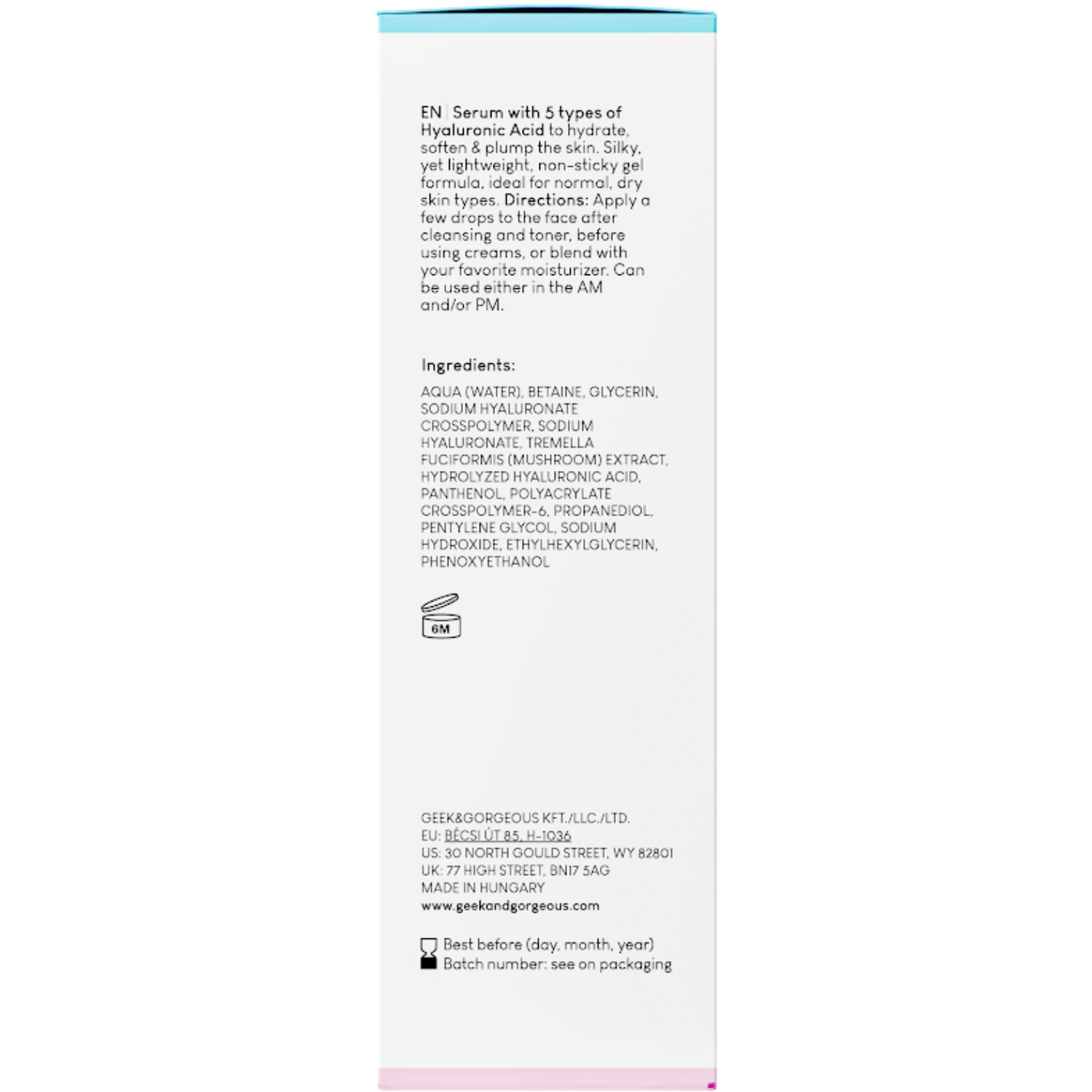 Geek & Gorgeous - HA 5 Rich - сыворотка с 5 видами гиалуроновой кислоты, которая интенсивно увлажняет, подтягивает и разглаживает кожу. Она обогащена экстрактом грибка - слизи с увлажняющим и антиоксидантным действием, а также пантенолом, снимающим раздражение кожи. Сыворотка обеспечивает коже соответствующее увлажнение, укрепляет защитный барьер кожи и смягчает эпидермис. Имеет гладкую гелевую текстуру, не оставляющую ощущения липкости. Лучше всего подходит для сухой и нормальной кожи. Имеет pH 4,5-5,5.