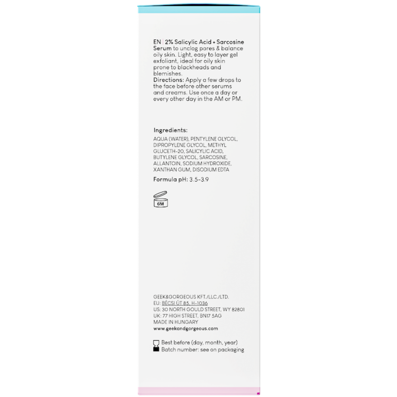 Geek & Gorgeous - Porefectly Clear - сыворотка с легкой, гелеобразной текстурой. Содержит салициловую кислоту в концентрации 2%, которая обладает противовоспалительными свойствами и очищает сальные железы. Она помогает в борьбе с несовершенствами кожи. Кроме того, саркозин, содержащийся в составе, регулирует секрецию кожного сала и дополнительно проявляет свойства против морщин. Аллантоин обладает успокаивающими свойствами и минимизирует раздражение. Имеет pH в диапазоне от 3,5 до 3,9.