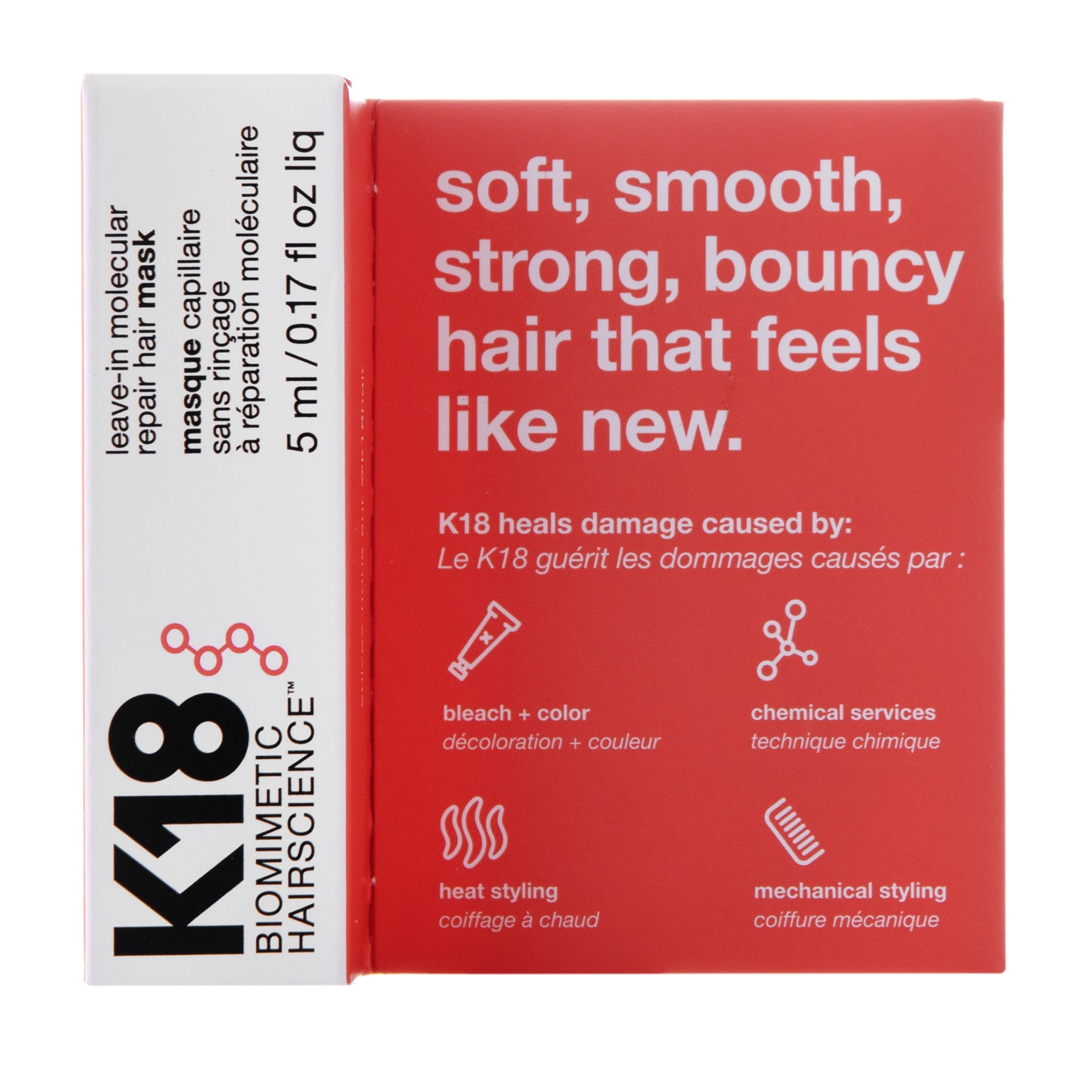 K18 - Leave-in Molecular Repair Hair Mask - несмываемая маска для всех типов волос. Способствует восстановлению поврежденной структуры волос, вызванной окрашиванием, осветлением и воздействием высоких температур. Она содержит запатентованный компонент K18PEPTIDE™ - это пептид, который укрепляет волосы и обладает восстанавливающим эффектом. Он нивелирует повреждения, восстанавливая кератиновые связи и дисульфидные мостики, улучшая состояние волос. Гиролизованные пшеничные протеины дополнительно увлажняют, смягчают и уменьшают электризацию волос. Маска улучшает эластичность, смягчает и разглаживает пряди.