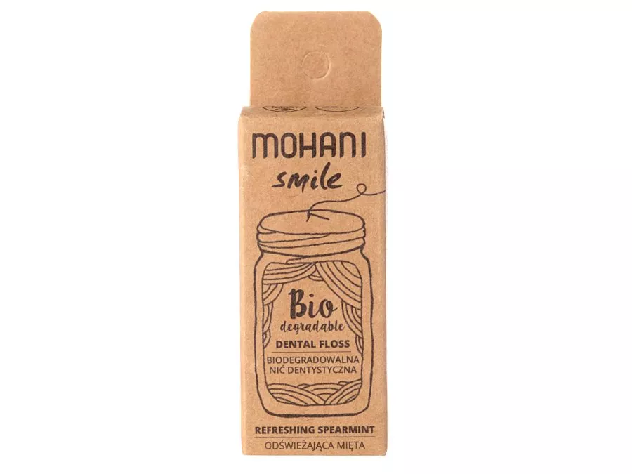 Mohani - Smile - Dental Floss - Биоразлагаемая зубная нить - Освежающая мята - экологически чистая альтернатива традиционным зубным нитям из искусственных материалов. Полностью натуральная, биоразлагаемая зубная нить мягко, но эффективно очищает промежутки между зубами. После использования она разлагается, не нанося вреда нашей планете. Изготовлена из кукурузного волокна вместо шелка, что делает ее на 100% пригодной для веганов. Продукт также обогащен маслом мяты, что придает свежий вкус. Стеклянная упаковка многоразовая. Когда у вас закончится зубная нить, вы можете купить только дополнительное пополнение продукта. Металлическая крышка баночки имеет практичный дозатор, позволяющий легко отрезать нужную длину нити.