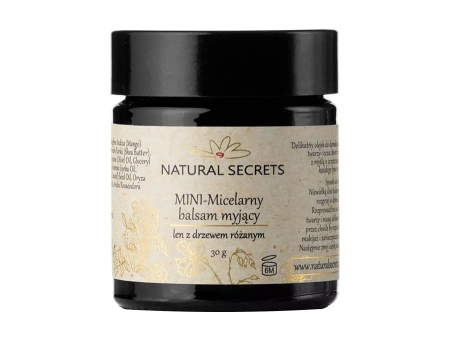 Natural Secrets - Micelarny balsam myjący - деликатный бальзам для снятия макияжа в виде сорбета, который не сушит кожу и очень эффективно очищает от загрязнений: себума, косметики и даже от водостойких средств с содержанием UV-фильтров. Содержит также масло семян манго, которое смягчает и удерживает воду в эпидермисе и льняное масло, которое успокаивает раздражения и уменьшает воспаление. Формула обогащена витамином Е, который является антиоксидантом и натуральным консервантом. Бальзам не оставляет жирности на коже и не является комедогенным, он полностью смывается после промывания водой из-за содержания эмульгатора.