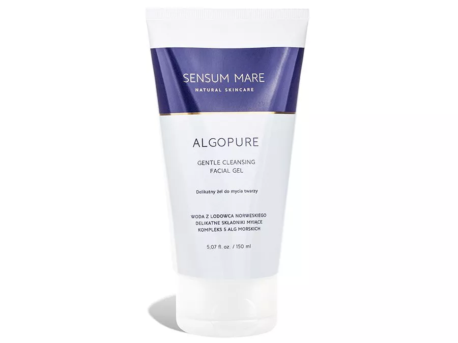 Sensum Mare - Algopure delikatny żel do mycia twarzy - гель, эффективно очищающий от кожного сала и загрязнений. Основным очищающим компонентом является децил глюкозид, который нежно очищает кожу. Гель также содержит комплекс из 5 морских водорослей, которые оказывают увлажняющее действие. Продукт на 100% веганский, упакован в экологическую трубу из 96% биомассы, полученной из сахарного тростника, обладает сертификатом I’m GREEN.