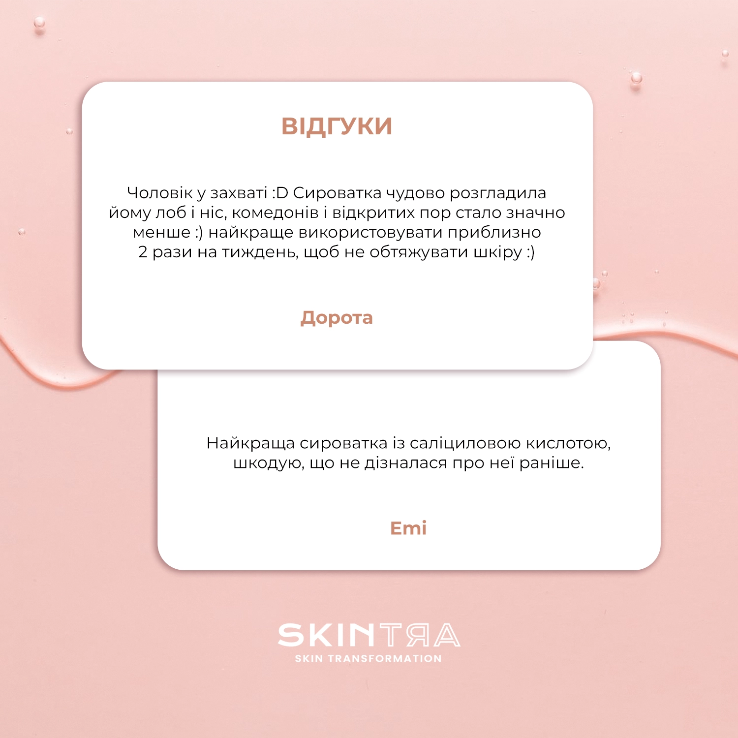Способ использования: Нанести несколько капель сыворотки на очищенную и тщательно высушенную кожу. Аккуратно распределить по всему лицу или на выбранном участке. После впитывания можно по желанию нанести крем. Избегать зоны вокруг глаз. Рекомендуем использовать сыворотку через каждые 2-3 дня. Не используйте средство, если у вас аллергия на салицилаты. Для тех, у кого сухая, но склонная к появлению высыпаний кожа, рекомендуем наносить крем через 10-15 минут после нанесения сыворотки.