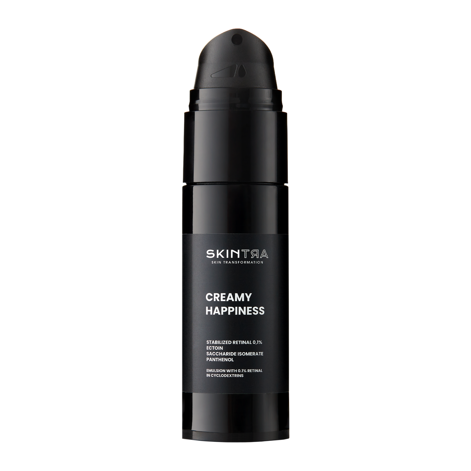 - ретиналь 0,1% в циклодекстринах – является предшественником ретиноевой кислоты и требует лишь одного преобразования, чтобы измениться на эту активную форму, очень эффективен в низких концентрациях и при этом хорошо переносится кожей. Стимулирует выработку коллагена, уменьшает заметность морщин и пигментацию, выравнивает тон кожи, разглаживает текстуру кожи и придает ей сияние, оказывает антибактериальное и противовоспалительное действие, уменьшая недостатки,