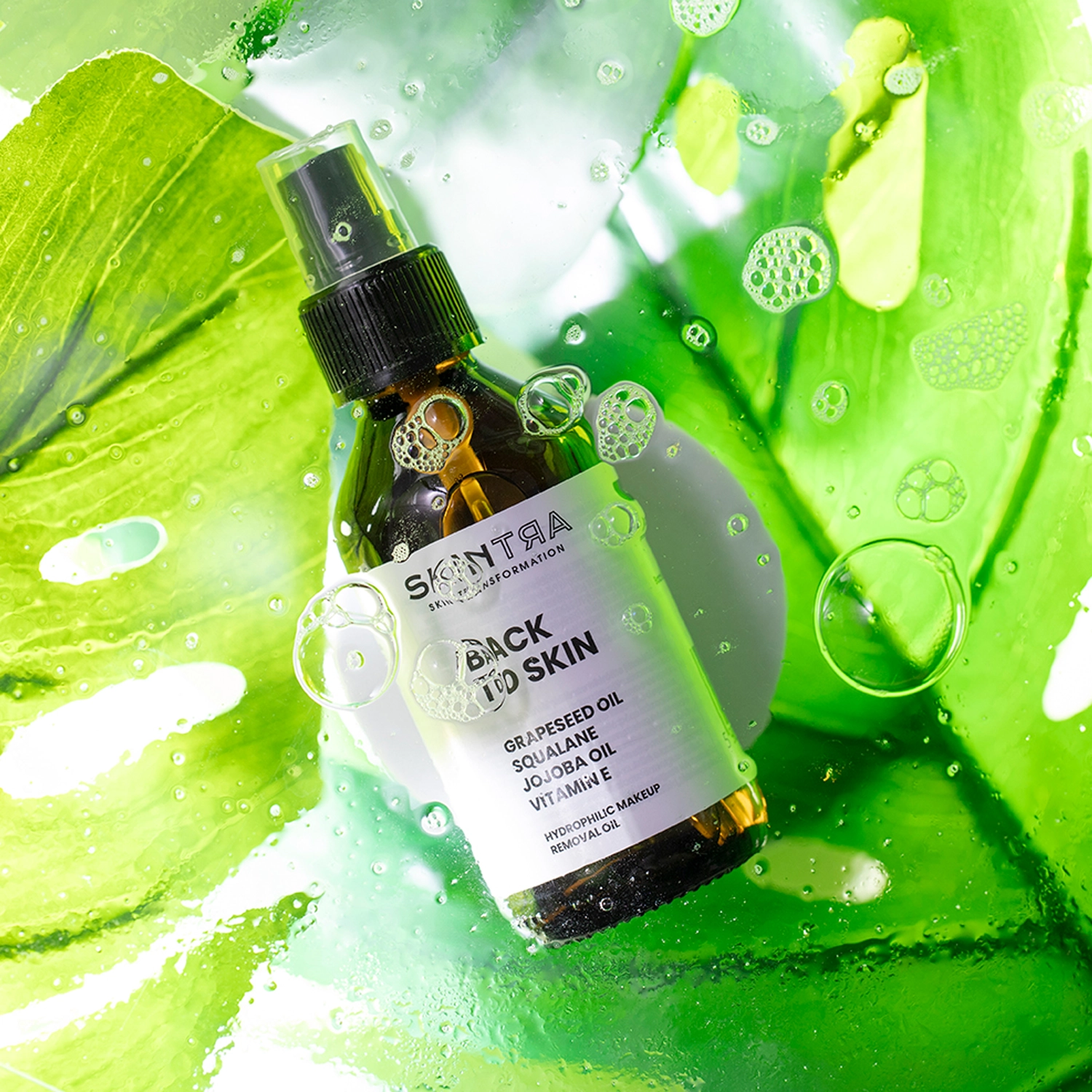 SkinTra - Back To Skin – гидрофильное масло для снятия макияжа. Натуральные масла, входящие в состав средства, эффективно устраняют липидные остатки макияжа с кожи. Среди них масло виноградных косточек, которое дополнительно оказывает антибактериальное и успокаивающее действие и помогает бороться с акне, а также масло жожоба, что повышает эластичность и упругость кожи. Сквалан регенерирует, увлажняет и питает кожу, а также облегчает поглощение других активных компонентов. Витамин Е дополнительно защищает кожу от свободных радикалов, способствуя сохранению ее молодого вида. Гидрофильное масло легко смывается, не оставляя жирной пленки, и является безопасным даже для снятия макияжа с глаз. Идеально подходит для всех типов кожи, в том числе для чувствительной. Средство упаковано в стеклянный флакон с помпой.