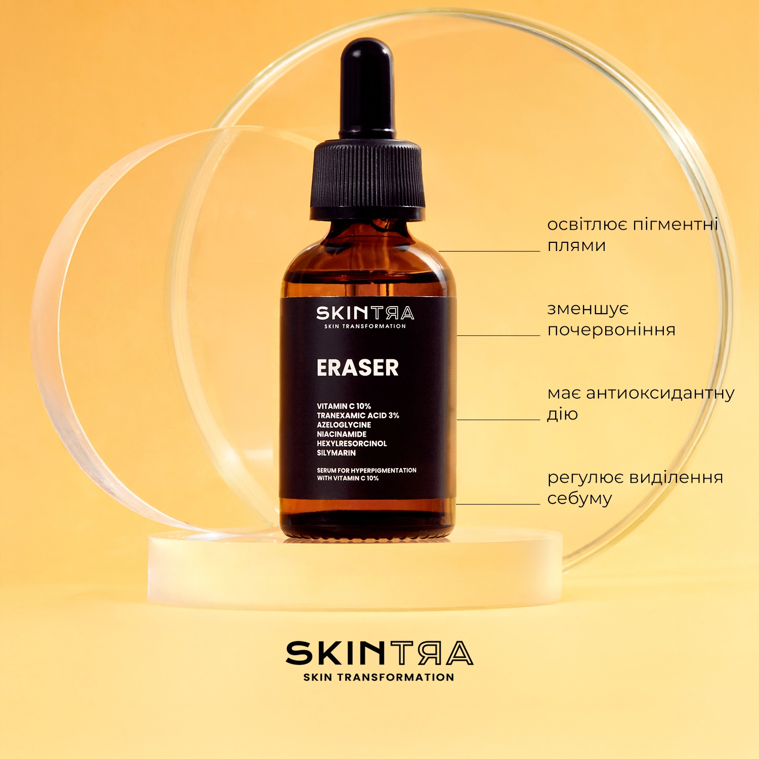 SkinTra - Eraser  комплексная сыворотка для кожи, которая борется с различными типами пигментации - как красными (поствоспалительными), так и коричневыми (вызванными избытком меланина). Средство имеет водянистую консистенцию, которая оставляет едва ощутимый слой на коже. Сыворотка имеет значение рН около 5. В состав входят эффективные активные компоненты, которые действуют на различные механизмы появления пигментации. Сыворотка содержит этилированный витамин С 10%, который обеспечивает антиоксидантное действие, а также осветляет кожу, воздействуя на синтез меланина путем подавления активности тирозиназы. В синергии с витамином С работает 3% транексамовая кислота, которая благодаря своим противовоспалительным свойствам способствует уменьшению покраснений, а также коричневых пигментных пятен. Ниацинамид способствует осветлению кожи, заботясь о ее увлажнении и регенерации. Также он усиливает действие гексилрезорцина, который уменьшает появление красных и коричневых пигментных пятен. Формула средства дополнительно содержит азелоглицин, который регулирует процесс отшелушивания кожи, а также силимарин, который обладает мощными антиоксидантными свойствами. Рекомендовано ежедневное и регулярное использование продукта вместе с защитой от солнца, чтобы увидеть результаты уже через несколько недель. Формула продукта веганская и не предназначена для использования беременными женщинами.