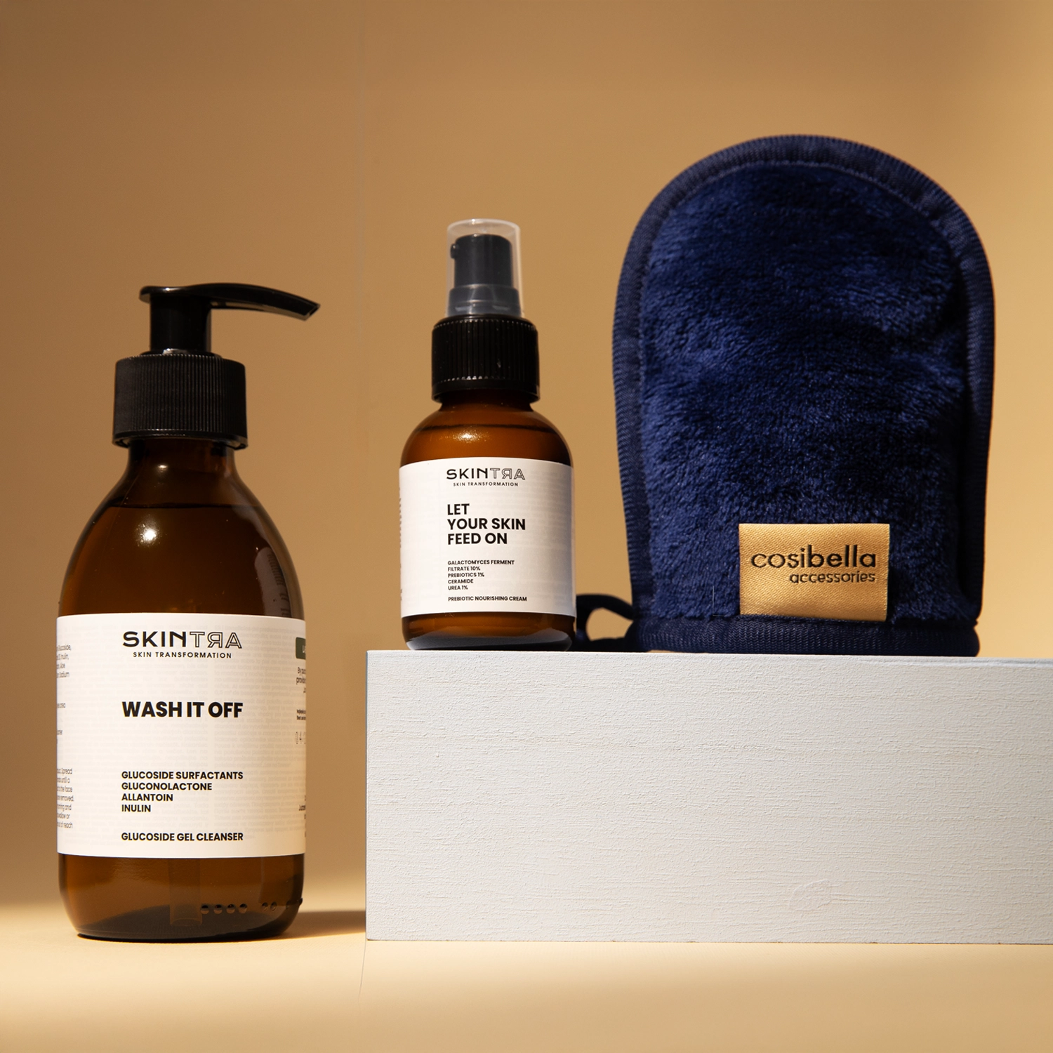 - SkinTra - Wash It Off – гель для умывания лица, который одновременно тщательно очищает кожу и защищает её защитный барьер. Для создания средства были использованы глюкозидные поверхностно-активные вещества, которые сочетают очищающие свойства, оставаясь при этом мягкими к микробиому и липидному барьеру кожи. Объём: 200 ml.