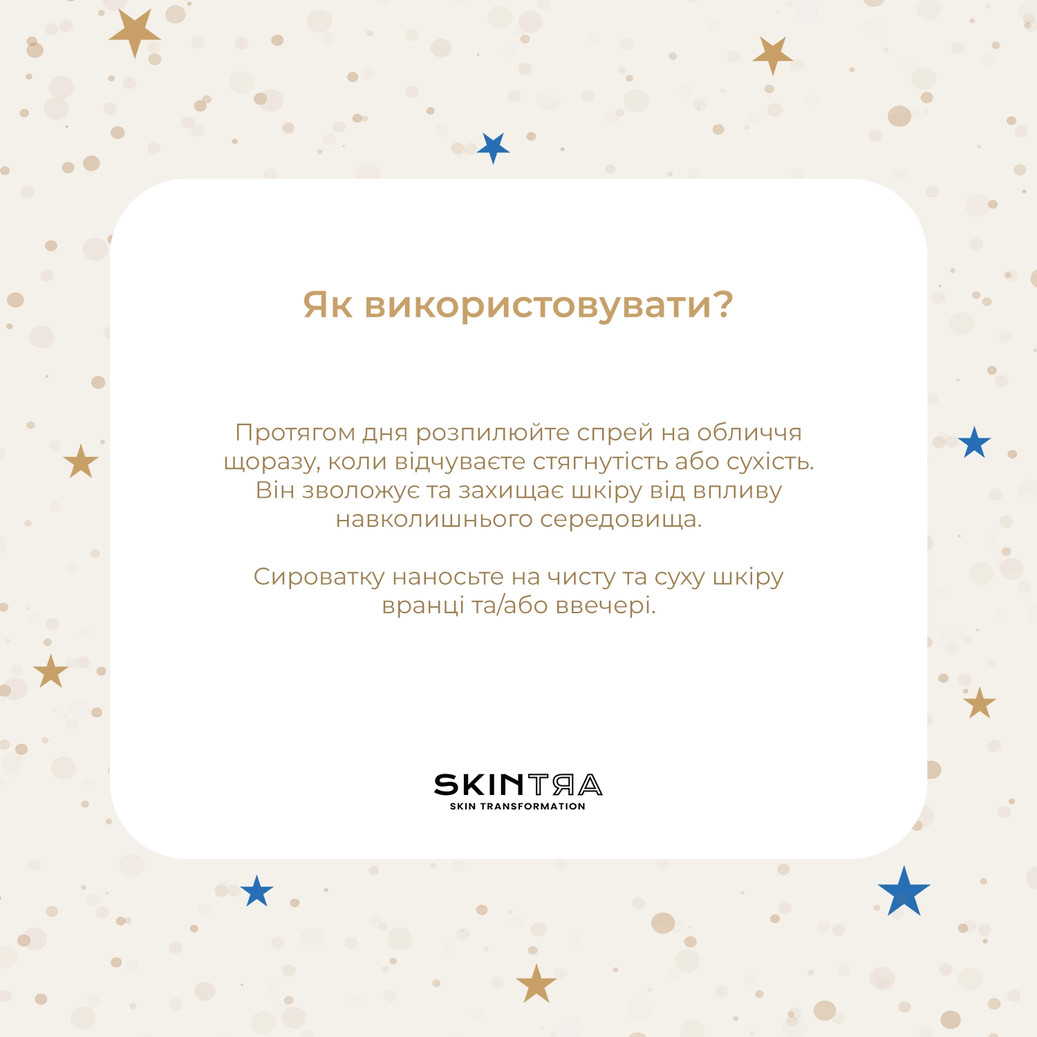 - Guard Your Skin - Защитная антиоксидантная эссенция – распылите спрей на очищенную и сухую кожу лица, шеи и декольте. Используйте ежедневно утром и вечером. Также можно распылять средство на лицо в течение дня. Спрей можно использовать перед SPF как антиоксидантный бустер.