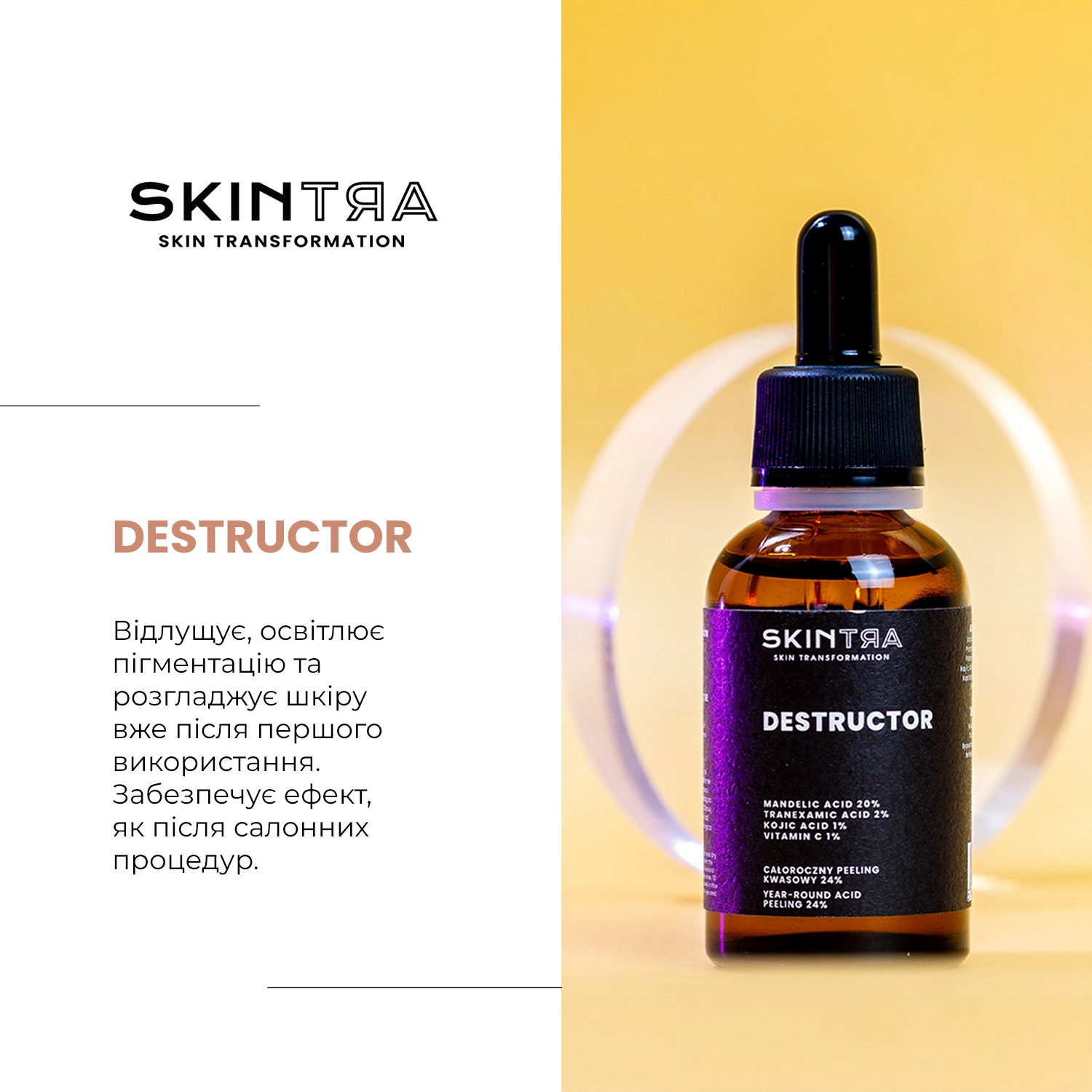 SkinTra - Destructor  кислотный пилинг, предназначенный для домашнего ухода за кожей лица в течение всего года. В его состав входят миндальная, койевая и транексамовая кислоты, азелоглицин и витамин С. Высокая концентрация кислот (24%) активно отшелушивает, разглаживает и осветляет кожу. Благодаря свойствам, которые подавляют активность энзима тирозиназы, средство уменьшает синтез меланина, снижая риск появления новых пигментных пятен. Если ваша кожа имеет неравномерный цвет, лишена блеска, тусклая, с комедонами и прыщами — это ваш маст-хэв! Этот продукт может удивить, так как обеспечивает заметный эффект косметологических процедур в домашних условиях уже после первого использования. Средство не имеет фототоксичного и фотосенсибилизационного потенциала, а его pH 2,7. Формула продукта веганская. Кислотный пилинг Destructor получил награду «Жемчужина косметического рынка 2022» в категории «Уход за кожей».
