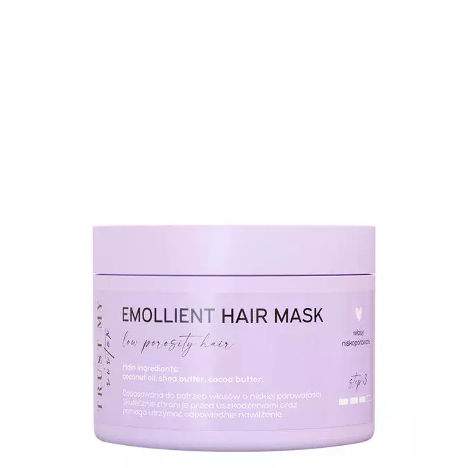 Trust My Sister - Emollient Hair Mask - смягчающая маска для волос с низкой пористостью. Имеет легкую формулу, которая не утяжеляет волосы и не лишает их объема. Содержит масло баобаба, которое оказывает кондиционирующее, смягчающее и разглаживающее действие. Масла ши и какао питают, придают эластичности и разглаживают волосы, а кокосовое масло поддерживает увлажненность волос и защищает их от выпадения. Благодаря маске волосы становятся гладкими, эластичными и более объемными.