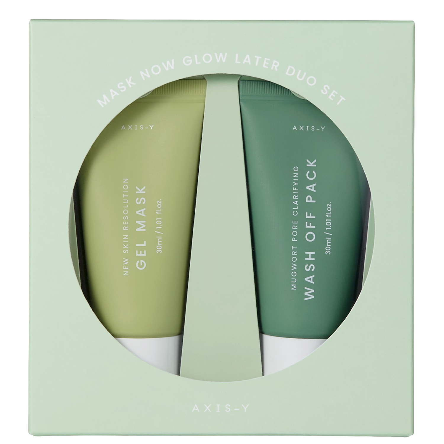 Axis-y - Mask Now Glow Later Duo Set – набір з двох масок для обличчя, які забезпечують очищення та відновлення. Вони містять безліч активних компонентів, зокрема екстракт центелли азіатської, екстракт полину та гіалуронову кислоту. Продукти підходять для догляду за усіма типами шкіри, включаючи шкіру, схильну до висипань. До складу набору входять: