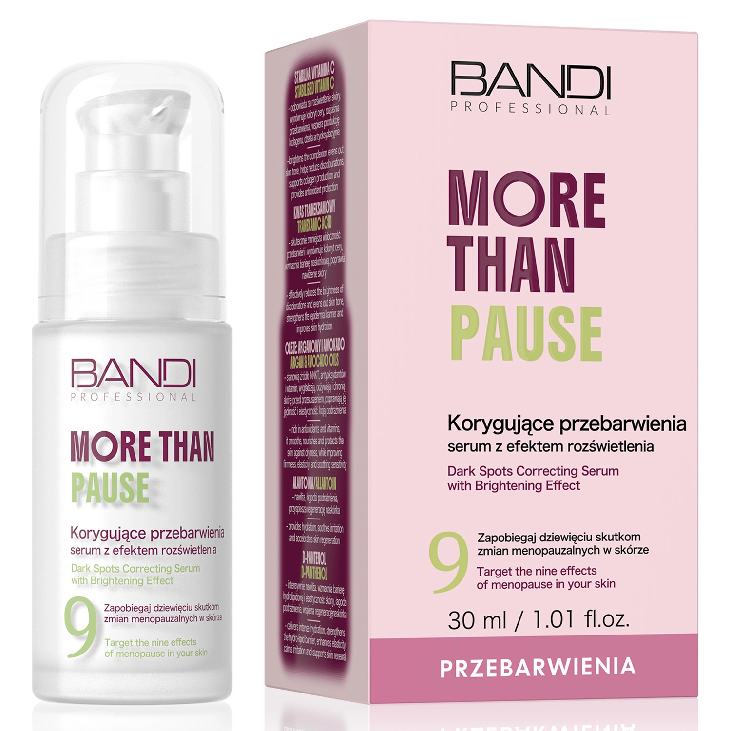 Bandi - More Than Pause сироватка для обличчя з лінії More Than Pause, створена спеціально для жінок у період менопаузи зі шкірою з нерівномірним відтінком і пігментними плямами. Засіб підвищує пружність та еластичність шкіри, а також повертає їй сяйво. За поступове освітлення пігментних плям відповідає комбінація стабільної форми вітаміну C з транексамовою кислотою, а алантоїн та арганова олія підвищують рівень зволоження та пружність шкіри.