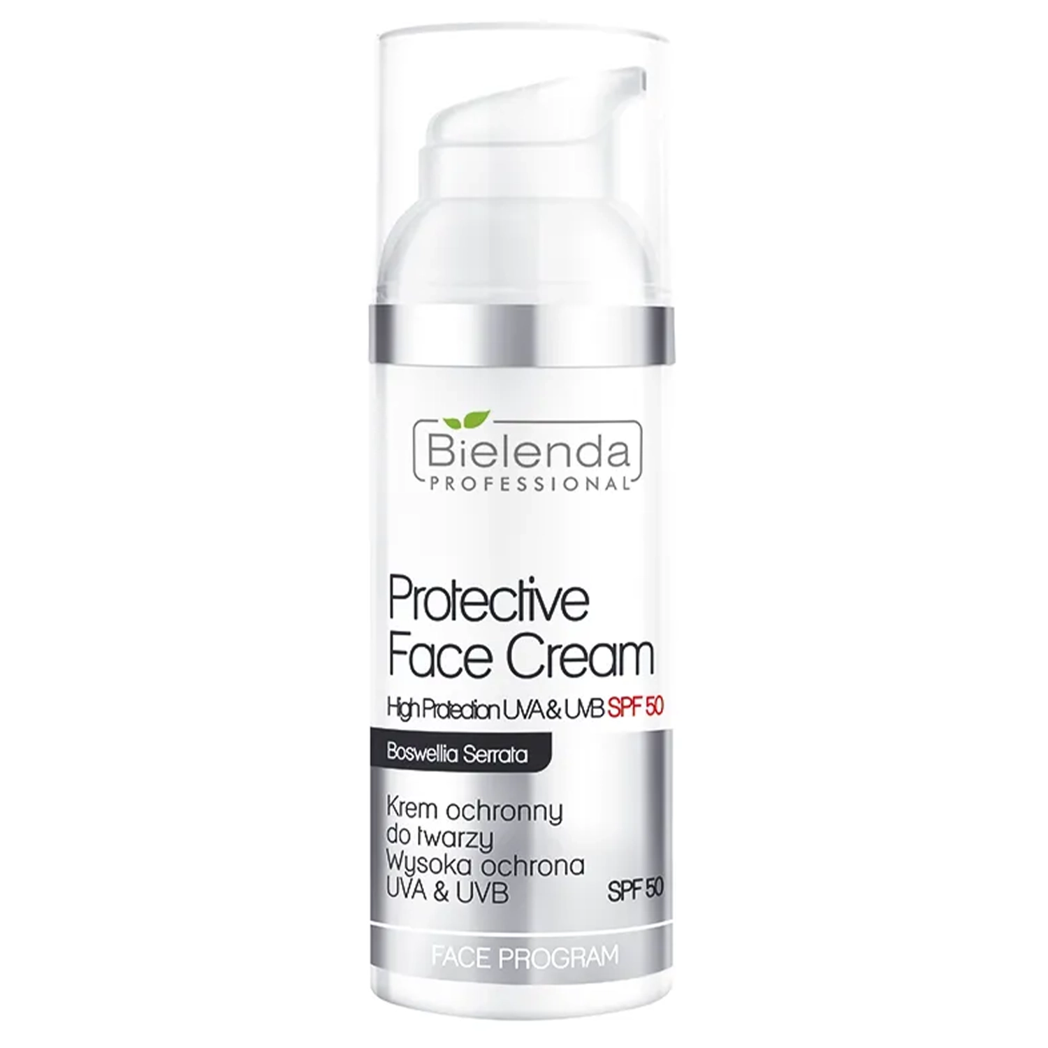 Bielenda Professional - Face Program - Protective Face Cream SPF50 - крем надає високий захист від UVA і UVB випромінювання за рахунок хімічних фільтрів в складі. Крім того, він містить гіалуронат натрію, який пов'язує воду в епідермісі, і масло ши, що запобігає її випаровуванню, завдяки цьому шкіра стає зволоженою. Екстракт босвеллії пильчатої регенерує, прискорює загоєння ран і подразнень, володіє антибактеріальними і протизапальними властивостями.