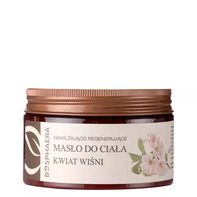Bosphaera - Зволожувально-регенерувальний баттер для тіла - Вишневий цвіт - засіб для тіла з олією виноградних кісточок, яка має живильну та пом'якшувальну дію, какао-маслом та олією ши, які утворюють на шкірі захисну плівку, що запобігає втраті води. Олія солодкого мигдалю додатково покращує еластичність шкіри та зміцнює її ліпідний бар'єр. Крім того, до складу засобу входить гідролат гамамелісу, який має заспокійливу та протизапальну дію, та бджолиний віск, що прискорює регенерацію шкіри. Продукт має вишневий аромат.