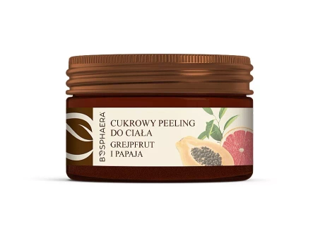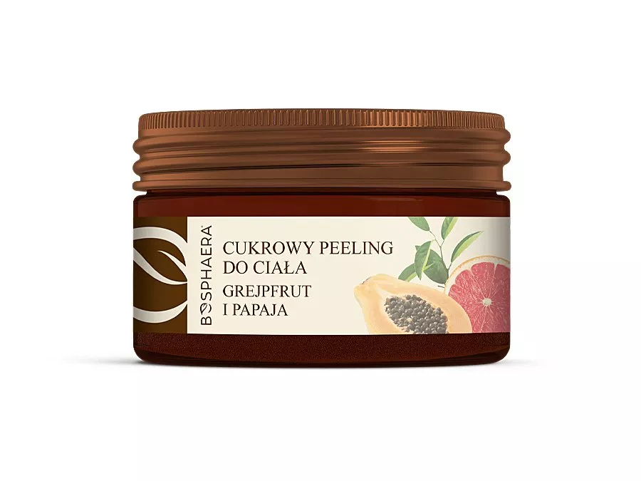Bosphaera - Цукровий скраб для тіла - Грейпфрут і папая - містить кристали цукру, які відлущують мертві клітини шкіри, розгладжують і стимулюють мікроциркуляцію. Олія андироби запобігає втраті води з епідермісу та змащує, а олії солодкого мигдалю та персикових кісточок пом'якшують і розгладжують шкіру. Крім того, вітамін Е зменшує кількість вільних радикалів і підтримує регенеративні процеси шкіри. Продукт поєднує в собі аромати грейпфрута та папаї.