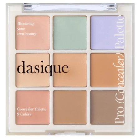 Dasique - Pro Concealer Palette - #01 Cover – палетка, що поєднує 9 відтінків кремових консилерів для обличчя. Створена для корекції недоліків шкіри, вирівнювання тону, контурингу, а також поєднання догляду та макіяжу. Склад продукту збагачений церамідами та екстрактом центелли азіатської, які запобігають пересиханню шкіри у місцях нанесення консилера та заспокоюють її. Суміш відтінків бежевого, рожевого, пастельної зелені та фіолетового дозволяє зменшити видимість пігментних плям, темних кіл під очима, недоліків та почервоніння шкіри. Формула кремових консилерів веганська.