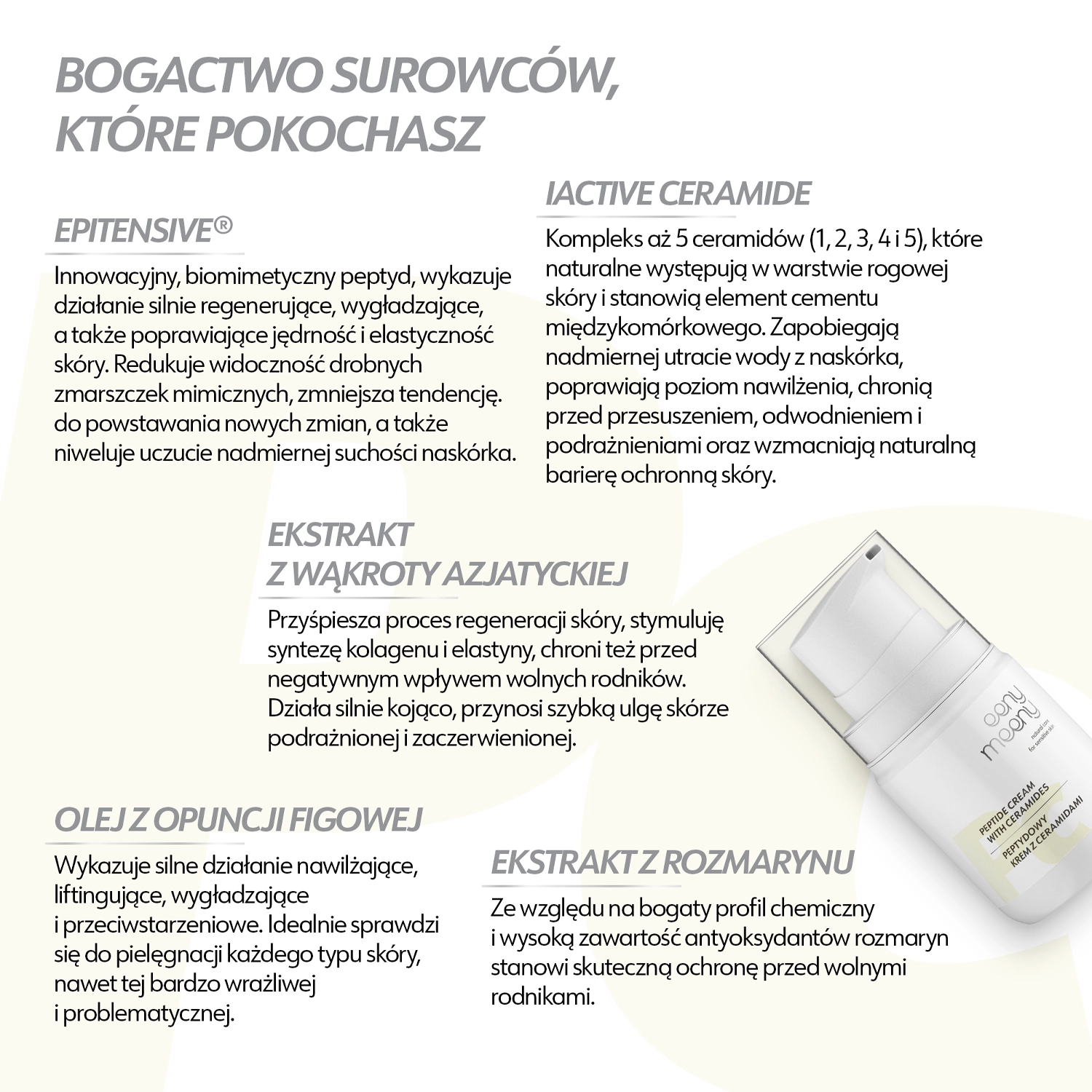 - комплекс із 5 церамідів - піклується про належне функціонування гідроліпідного бар'єру, відповідає за регенерацію шкіри, живить, зменшує трансепідермальну втрату вологи,