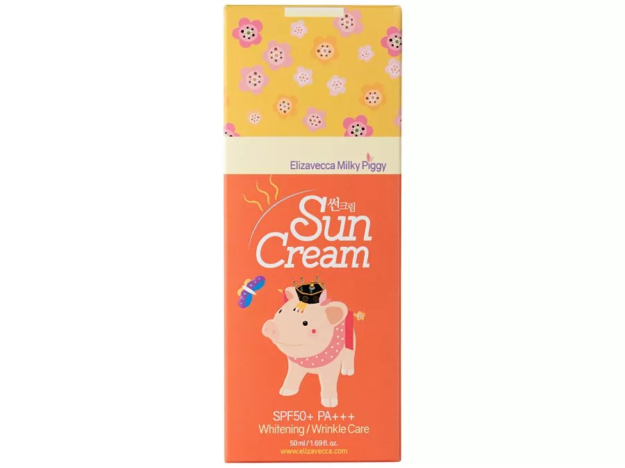 Elizavecca - Milky Piggy Sun Cream SPF 50+/PA+++ - сонцезахисний крем. Він містить як хімічні, так і фізичні фільтри, що забезпечують повний захист шкіри від ультрафіолетового випромінювання. Крем також містить ніацинамід, який регулює роботу сальних залоз, а також освітлює шкіру і має протизапальні властивості. Засіб має легку текстуру і швидко вбирається. Не відбілює, але надає легкий освітлюючий ефект.