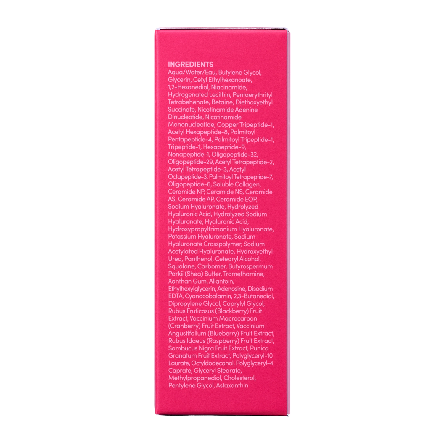 Aqua, Butylene Glycol, Glycerin, Cetyl Ethylhexanoate, 1,2-Hexanediol, Niacinamide, Hydrogenated Lecithin, Pentaerythrityl Tetrabehenate, Betaine, Diethoxyethyl Succinate, Nicotinamide Adenine Dinucleotide, Nicotinamide Mononucleotide, Copper Tripeptide-1, Acetyl Hexapeptide-8, Palmitoyl Pentapeptide-4, Palmitoyl Tripeptide-1, Tripeptide-1, Hexapeptide-9, Nonapeptide-1, Oligopeptide-32, Oligopeptide-29, Acetyl Tetrapeptide-2, Acetyl Tetrapeptide-3, Acetyl Octapeptide-3, Palmitoyl Tetrapeptide-7, Oligopeptide-6, Soluble Collagen, Ceramide NP, Ceramide NS, Ceramide AS, Ceramide AP, Ceramide EOP, Sodium Hyaluronate, Hydrolyzed Hyaluronic Acid, Hydrolyzed Sodium Hyaluronate, Hyaluronic Acid, Hydroxypropyltrimonium Hyaluronate, Potassium Hyaluronate, Sodium Hyaluronate Crosspolymer, Sodium Acetylated Hyaluronate, Hydroxyethyl Urea, Panthenol, Cetearyl Alcohol, Squalane, Carbomer, Butyrospermum Parkii (Shea) Butter, Tromethamine, Xanthan Gum, Allantoin, Ethylhexylglycerin, Adenosine, Disodium EDTA, Cyanocobalamin, 2,3-Butanediol, Dipropylene Glycol, Caprylyl Glycol, Rubus Fruticosus (Blackberry) Fruit Extract, Vaccinium Macrocarpon (Cranberry) Fruit Extract, Vaccinium Angustifolium (Blueberry) Fruit Extract, Rubus Idaeus (Raspberry) Fruit Extract, Sambucus Nigra Fruit Extract, Punica Granatum Fruit Extract, Polyglyceryl-10 Laurate, Octyldodecanol, Polyglyceryl-4 Caprate, Glyceryl Stearate, Methylpropanediol, Cholesterol, Pentylene Glycol, Astaxanthin