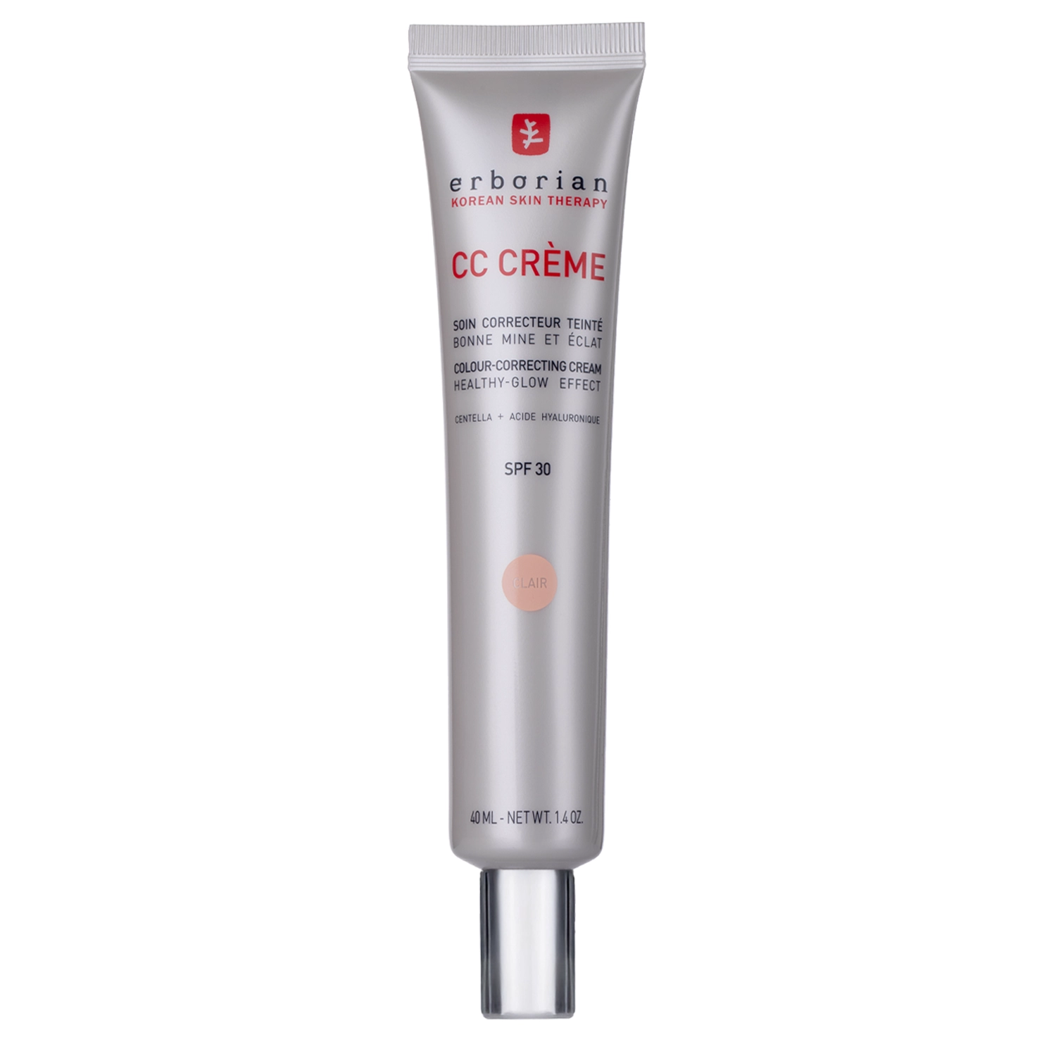 Erborian - CC Creme Centella Asiatica - Clair – CC-крем для обличчя із сонцезахисними фільтрами SPF 30. Вирівнює тон шкіри, маскує недоліки та почервоніння, залишає на шкірі натуральний, сяючий фініш. Пігменти, що містяться в капсулах, огортають шкіру легкою, кремовою текстурою без ефекту маски. Засіб делікатно вирівнює тон шкіри, створюючи натуральний макіяж, та підтримує захист шкіри від впливу UV-випромінювання завдяки наявності сонцезахисних фільтрів. Екстракт листя центелли азіатськоїгіалуронат натрію та бісаболол відповідають за належне зволоження, заспокоюють подразнення й дарують відчуття комфорту. Крем знаходиться у зручній тубі.