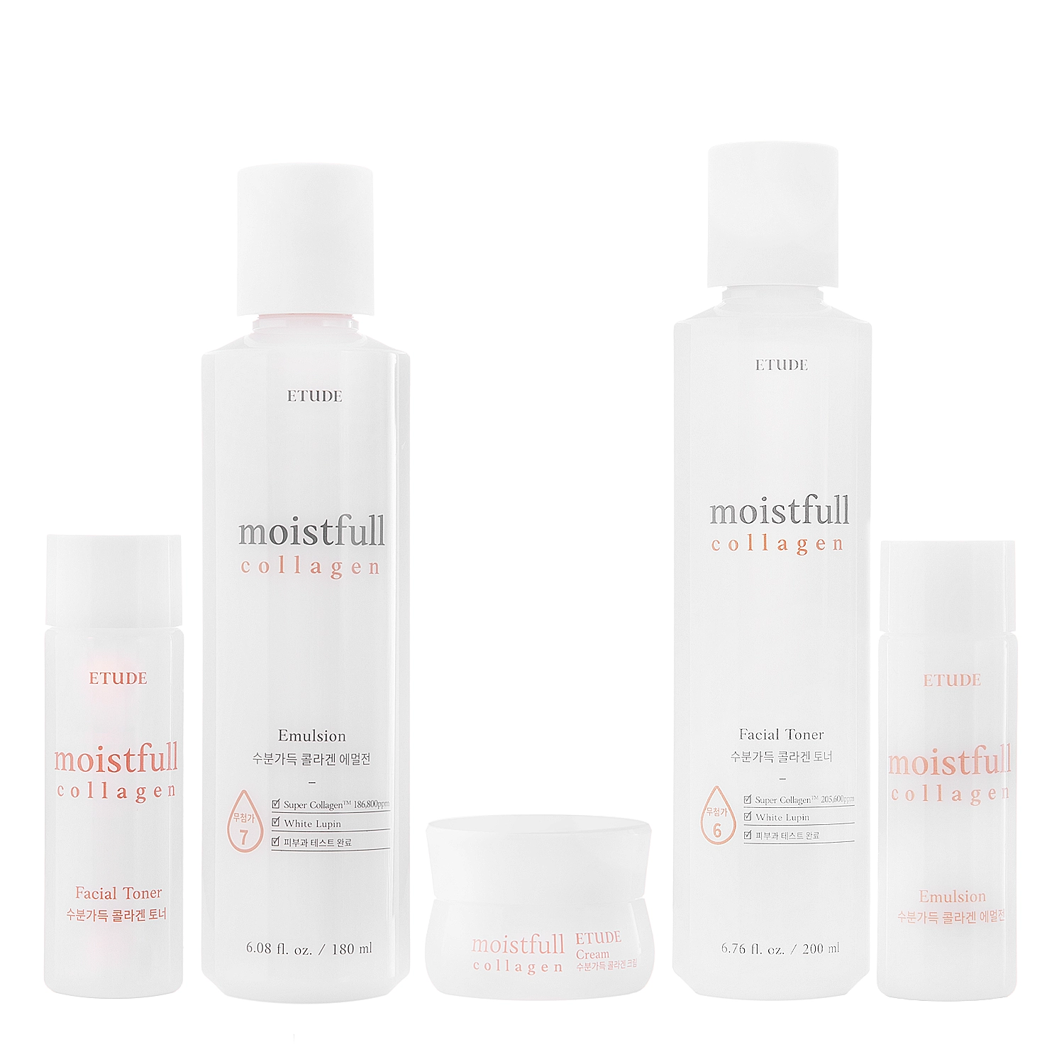 Moistfull Collagen Emulsion: Water, Hydrolyzed Collagen, Butylene Glycol, Adansonia Digitata Fruit Extract, Glycerin, Pentaerythrityl Tetraethylhexanoate, Cyclopentasiloxane, Hydrogenated Poly(C6-14 Olefin), Polysorbate 60, Cyclohexasiloxane, Adansonia Digitata Seed Oil, Hydrogenated Vegetable Oil, Glyceryl Stearate, Dimethiconol, Cetearyl Alcohol, Sorbitan Stearate, Ammonium Acryloyldimethyltaurate/Vp Copolymer, Ethylhexylglycerin, Alcohol, Carbomer, Tromethamine, Poloxamer 407, Peg-100 Stearate, Phytantriol, Hydroxyethyl Acrylate/Sodium Acryloyldimethyl Taurate Copolymer, Phenoxyethanol, Disodium Edta, Parfum