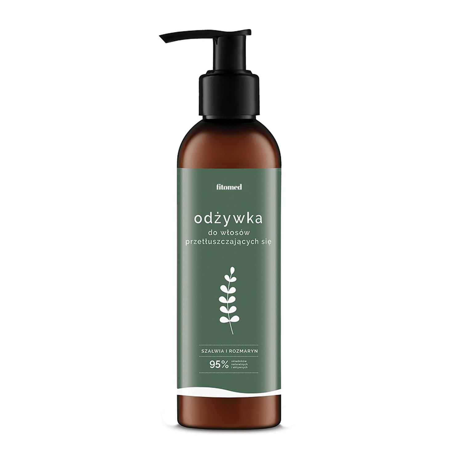 FFitomed - Кондиціонер для жирного волосся - складається з рослинних екстрактів, зокрема розмарину і шавлії, які допомагають у боротьбі з лупою, себореєю і жирністю волосся. Вони мають протизапальну та зміцнювальну дію. Пантенол зволожує і заспокоює, а біотин покращує стан волосся та підтримує його здоровий вигляд. Продукт веганський і містить 95% компонентів натурального походження.