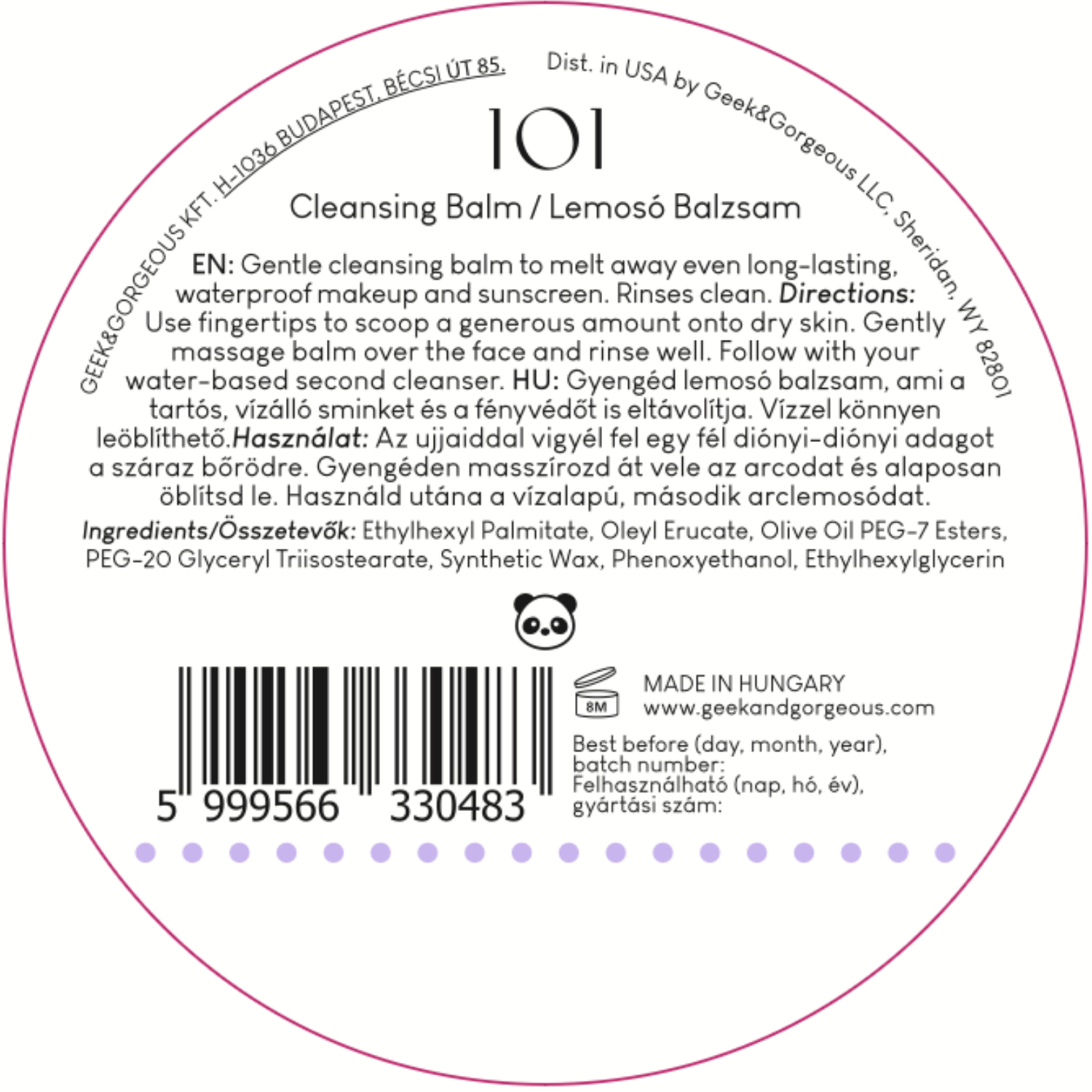 Geek & Gorgeous - Очищувальний бальзам для обличчя - бальзам, який розчиняє макіяж, видаляє забруднення та залишки сонцезахисного крему. Він також легко видаляє водостійкий макіяж. Бальзам перетворюється на олію під дією тепла шкіри, а при контакті з водою він емульгується, тому легко змивається зі шкіри у вигляді молочної емульсії. Засіб містить компоненти, які глибоко очищують і пом'якшують шкіру, зокрема етилгексил пальмітат, PEG-20 Glyceryl Triisostearate та Oleyl Erucate. Продукт веганський та безпечний для вагітних.