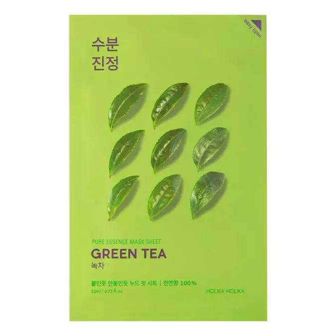 Holika Holika - Pure Essence Mask Sheet - Green Tea - маска виготовлена з тонкої бавовни, просоченої цінними активними компонентами, і ідеально адаптується до форми обличчя. Містить екстракт зеленого чаю, що володіє протизапальними, антиоксидантними та злегка в'яжучими властивостями, а також екстракт центелли азіатської, який заспокоює і стимулює процеси регенерації епідермісу. Засіб також містить бетаїн і пантенол, які підвищують рівень зволоження шкіри, і алантоїн, який заспокоює і знімає подразнення. Після зняття маски шкіра стає свіжою і зволоженою, тому вона особливо підходить для комбінованої, зневодненої шкіри.