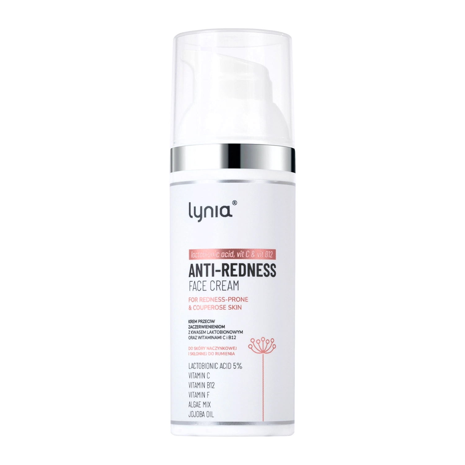 Lynia - Крем проти почервоніння з лактобіоновою кислотою та вітамінами C і B12 – крем для обличчя, рекомендований для чутливої, схильної до подразнень та судинної шкіри. Основним активним компонентом є лактобіонова кислота 5%, яка зміцнює стінки кровоносних судин і зменшує локальне почервоніння. Окрім цього, компонент забезпечує оптимальний рівень зволоження, а разом із вітаміном B12 мінімізує запалення і заспокоює подразнену шкіру. Водночас вітамін C забезпечує антиоксидантну та стимулюючу дію, а вітамін F зміцнює епідермальний бар'єр і захищає від пересихання. Композицію доповнюють водорості з ревіталізуючими та зволожувальними властивостями. Крем повертає шкірі комфорт, заспокоює і зволожує її. Продукт підходить для веганів.
