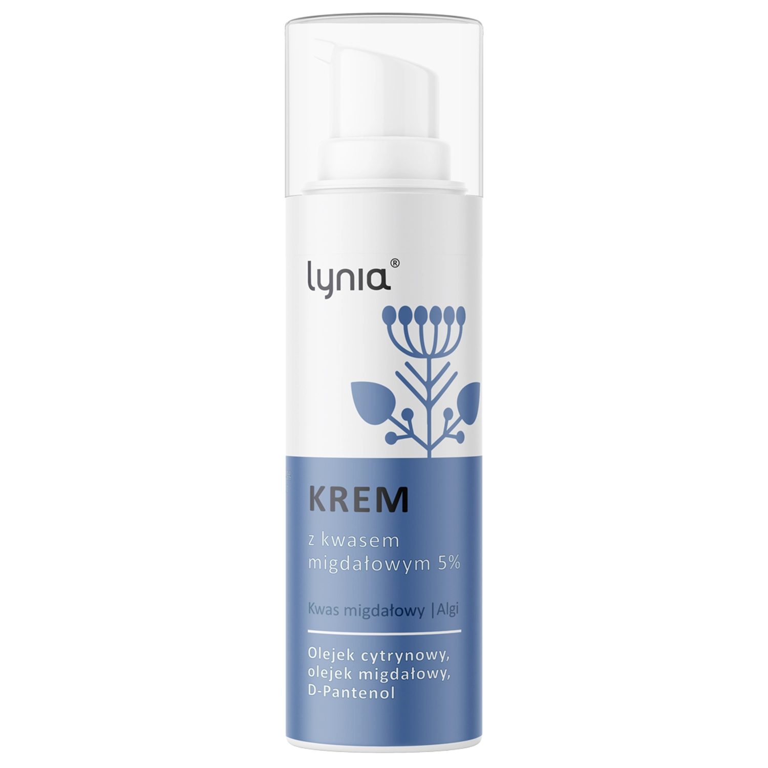 Lynia - Крем з 5% мигдальною кислотою - живильний крем з мигдальною кислотою, яка належить до групи альфа-гідроксильних кислот (AHA). Через молекули великого розміру вона діє більш м'яко, ніж інші кислоти AHA - повільно проникає в шкіру і підходить для догляду за всіма типами шкіри, навіть чутливої. Олія солодкого мигдалю надає оклюзійну дію, комплекс з морськими водоростями регенерує і зволожує, а пантенол заспокоює і знімає подразнення.