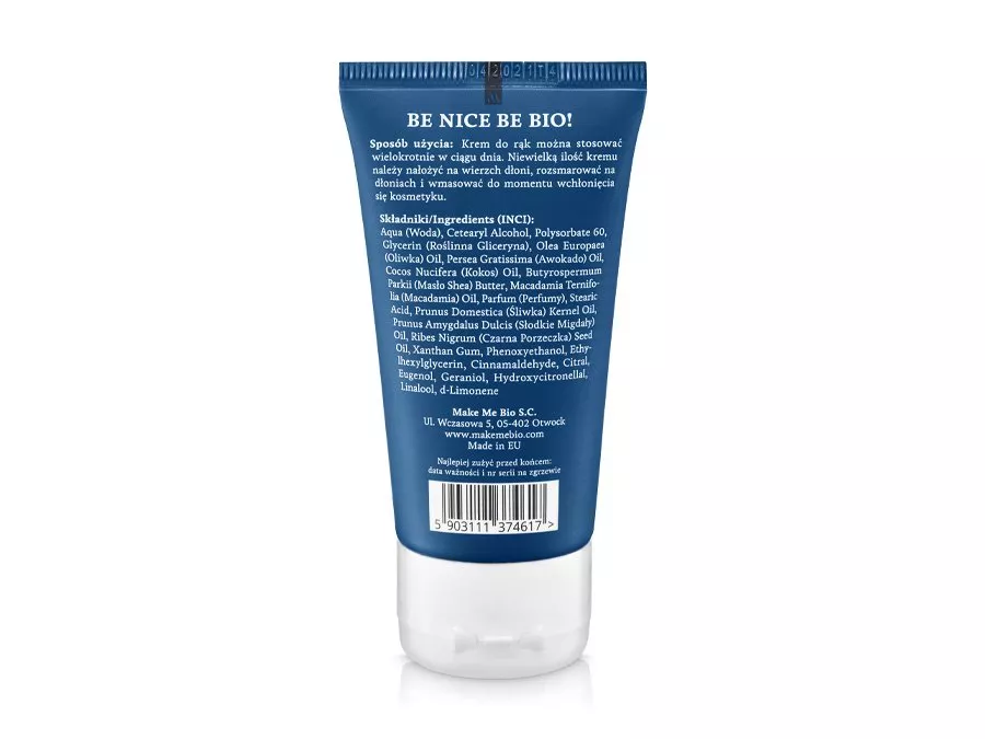 Make Me Bio - Регенеруючий крем для рук - містить комплекс рослинних олій, які живлять шкіру рук. Оливкова олія зволожує шкіру, олія авокадо покращує еластичність і залишає шкіру гладкою, олія макадамії регенерує шкіру, олія сливових кісточок заспокоює подразнення і має антивікові властивості. Поєднання таких компонентів у кремі забезпечує живлення та регенерацію шкіри рук.