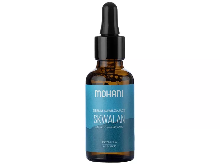 Mohani - Skwalan - Натуральна зволожуюча сироватка - сквалан істотно впливає на проникнення активних компонентів з інших косметичних засобів, що використовуються в ранковому і вечірньому догляді. Даний засіб швидко відновлює шкіру, заспокоює роздратування. Підходить для всіх типів шкіри, тому що олія не комедогенна. Особливе поліпшення стану буде помітно на сухій, почервонілій, чутливій шкірі та шкірі з куперозом.