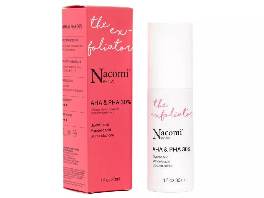 Nacomi - Сироватка з 30% комплексом кислот AHA і PHA - містить кислоти AHA, в тому числі гліколеву, мигдалеву, лимонну, винну, які володіють кератолітичною дією, регулюють роботу сальних залоз і освітлюють пігментні плями, а також кислоти PHA, такі як молочна, лактобіонова, глюконолактон, які м'яко відлущують, а також зволожують шкіру . Сік алое заспокоює, загоює і зволожує, а гіалуронова кислота у формі Sodium Hyaluronate пов'язує воду, підтримуючи необхідний рівень зволоження шкіри.