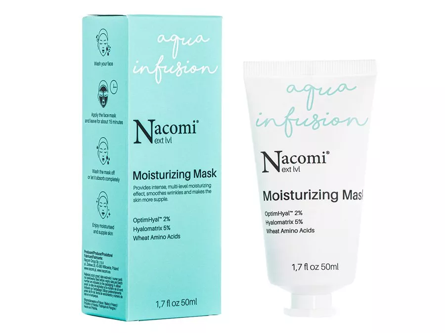 Nacomi - Зволожувальна маска для обличчя - містить компоненти, які покращують рівень вологи в шкірі, такі як гіалуронова кислота в 4 формах, комплекс Optim Hyal та амінокислоти пшениці. Маска збагачена протизапальним ніацинамідом та олією солодкого мигдалю, яка захищає шкіру від сухості, пом'якшує і покращує еластичність. Маска зменшує відчуття стягнутості й надає сильну дозу зволоження для сухої, зневодненої та пересушеної шкіри. Продукт створений із сировини натурального походження.