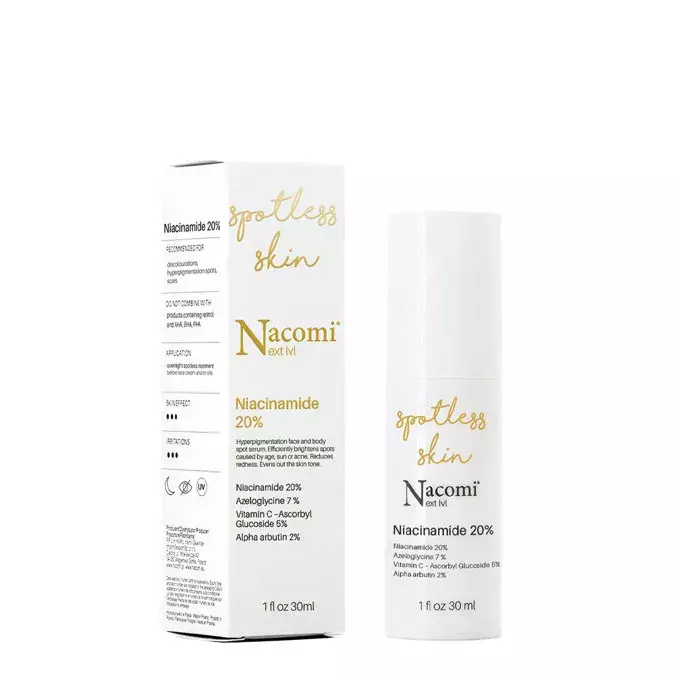 Nacomi – Next Level – Niacinamide 20% – засіб для точкового застосування при пігментації. Завдяки ніацинаміду, вітаміну С, азелогліцину та альфа-арбутину сироватка підтримує боротьбу з пігментацією різного походження, освітлюючи та запобігаючи її утворенню. Продукт збагачений зволожуючою трегалозою та гіалуроновою кислотою, яка покращує регенерацію шкіри. Засіб вирівнює тон, діє проти зморшок, а також прискорює загоєння шкіри завдяки своїм протизапальним властивостям.