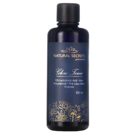 Natural Secrets - Тонізуючий освітлюючий засіб - засіб, що містить комбінацію активних інгредієнтів з натуральними, рослинними екстрактами, які володіють сильними протизапальними, освітлюючими і розгладжуючими властивостями. Продукт містить 10% концентрацію лактобіоновой кислоти і 4% ніацинамід (вітамін B3), завдяки яким делікатно освітлює пігментні плями і регулює роботу сальних залоз. Екстракти рожевого лотоса, центели і соку алое мають заспокійливу дію і додатково освітлюють шкіру. Пантенол і низькомолекулярна гіалуронова кислота заспокоюють і зволожують шкіру. Засіб упаковано в біофотонне скло, яке захищає від сонячного світла.