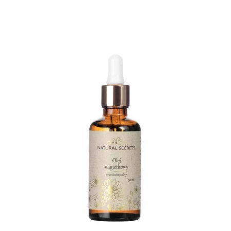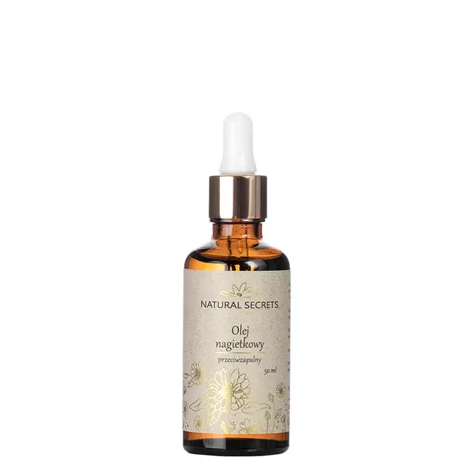Natural Secrets - Olej Nagietkowy - олія отримана шляхом мацерації квіток календули лікарської в олії солодкого мигдалю. Квітки календули мають сильні протизапальні і заспокійливі властивості, тому вона відмінно підходить для догляду навіть за дуже чутливою і подразненою шкірою. Органічна олія солодкого мигдалю захищає шкіру, робить її еластичною і регенерує.