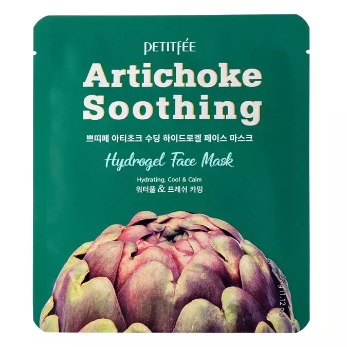 Petitfee – Artichoke Soothing Hydrogel Face Mask – гідрогелева маска для обличчя з екстрактом артишоку, яка знижує секрецію шкірного сала та знімає запалення. Екстракт зеленого чаю має антиоксидантні, протизапальні та заспокійливі властивості, а екстракт алое віра прискорює загоєння ран, заспокоює та пом'якшує подразнену шкіру, має зволожуючі властивості. Екстракт центелли азіатської прискорює загоєння ран, знімає запалення, має антиоксидантні та антибактеріальні властивості, допомагає зменшити набряклість та сприяє регенерації шкіри.
