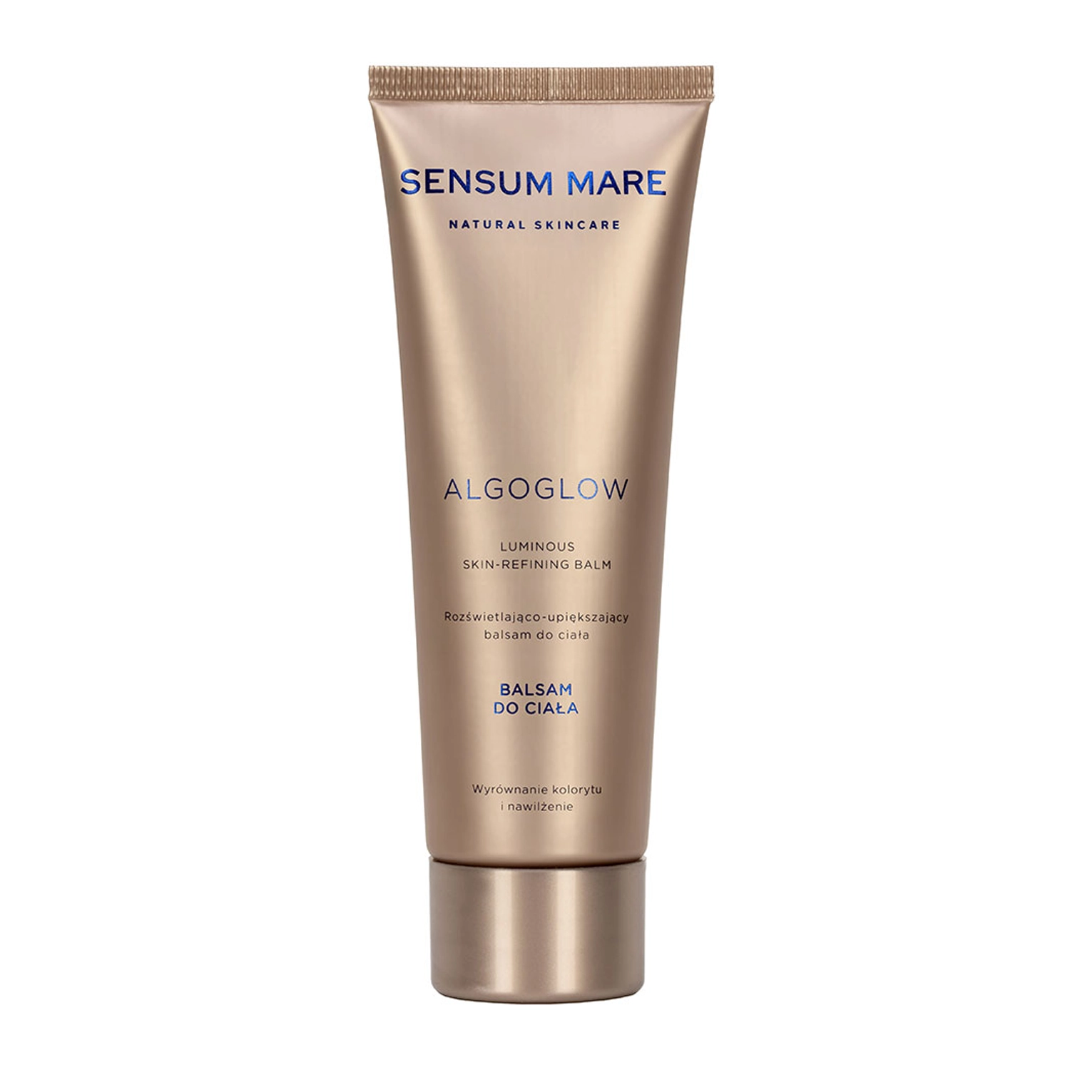 Sensum Mare - Algoglow - Luminous Skin-Refining Balm - легкий бальзам для тіла, який надає шкірі ефект ледь помітної засмаги з красивим золотистим сяйвом. Завдяки комплексу водоростей косметичний засіб підвищує рівень зволоження шкіри, а екстракт кореня женьшеню проявляє антивікові властивості, стимулюючи синтез колагену та еластину. Водночас один із найсильніших і найефективніших антиоксидантів, тобто вітамін Е, підтримує захист шкіри від вільних радикалів і посилює процеси регенерації. Соняшникова олія додатково створює на поверхні епідермісу плівку, яка захищає його від надмірної втрати води, одночасно розгладжуючи шкіру. Композицію завершує яблучний сік, який живить і помʼякшує шкіру. Бальзам швидко поглинається і не залишає плям на одязі. Крім того, він має тонкий, чуттєвий аромат, який залишається на шкірі на кілька годин. До складу засобу входить 96% компонентів натурального походження. Продукт підходить для веганів.