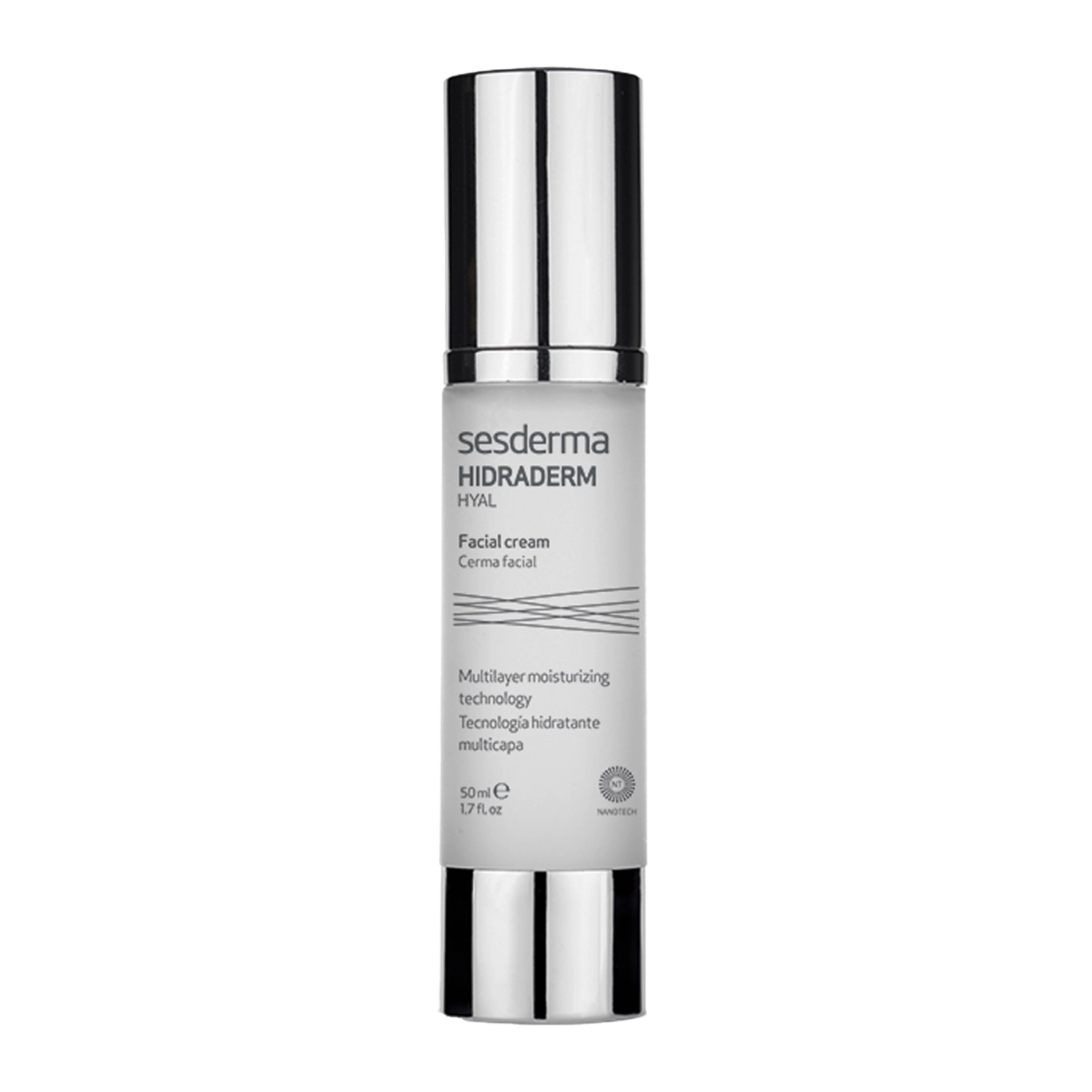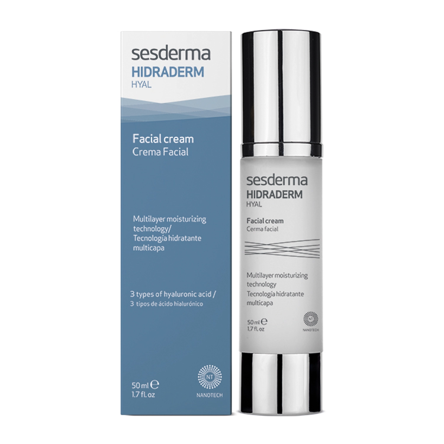 sesderma - Hidraderm Hyal Moisturizing Facial Cream  крем для обличчя, який забезпечує багаторівневе зволоження шкіри. Відмінно підходить для усіх типів шкіри, у тому числі для сухої, зневодненої та подразненої. Містить гіалуронову кислоту та олію солодкого мигдалю, які забезпечують необхідний рівень зволоження, а також огортають шкіру живильною оклюзійною плівкою. Водночас вітамін E захищає від надмірного оксидативного стресу. Крем у зручному пакуванні airless, його формула швидко поглинається, не залишаючи жирної плівки на шкірі.